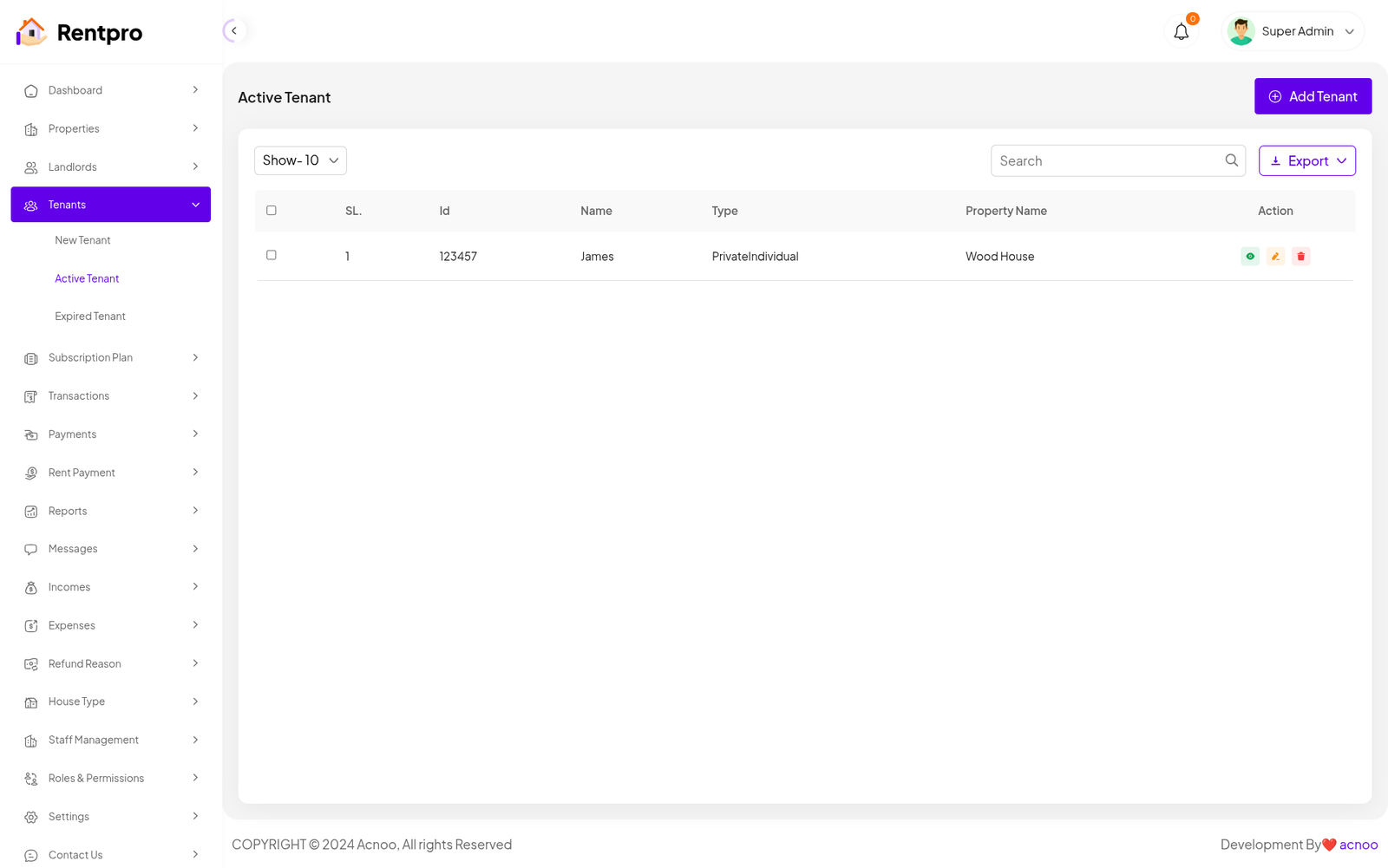 The "Active Tenant" page displays a list of all tenants who currently have an active rental agreement and are using the platform.