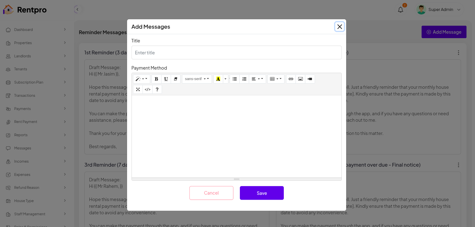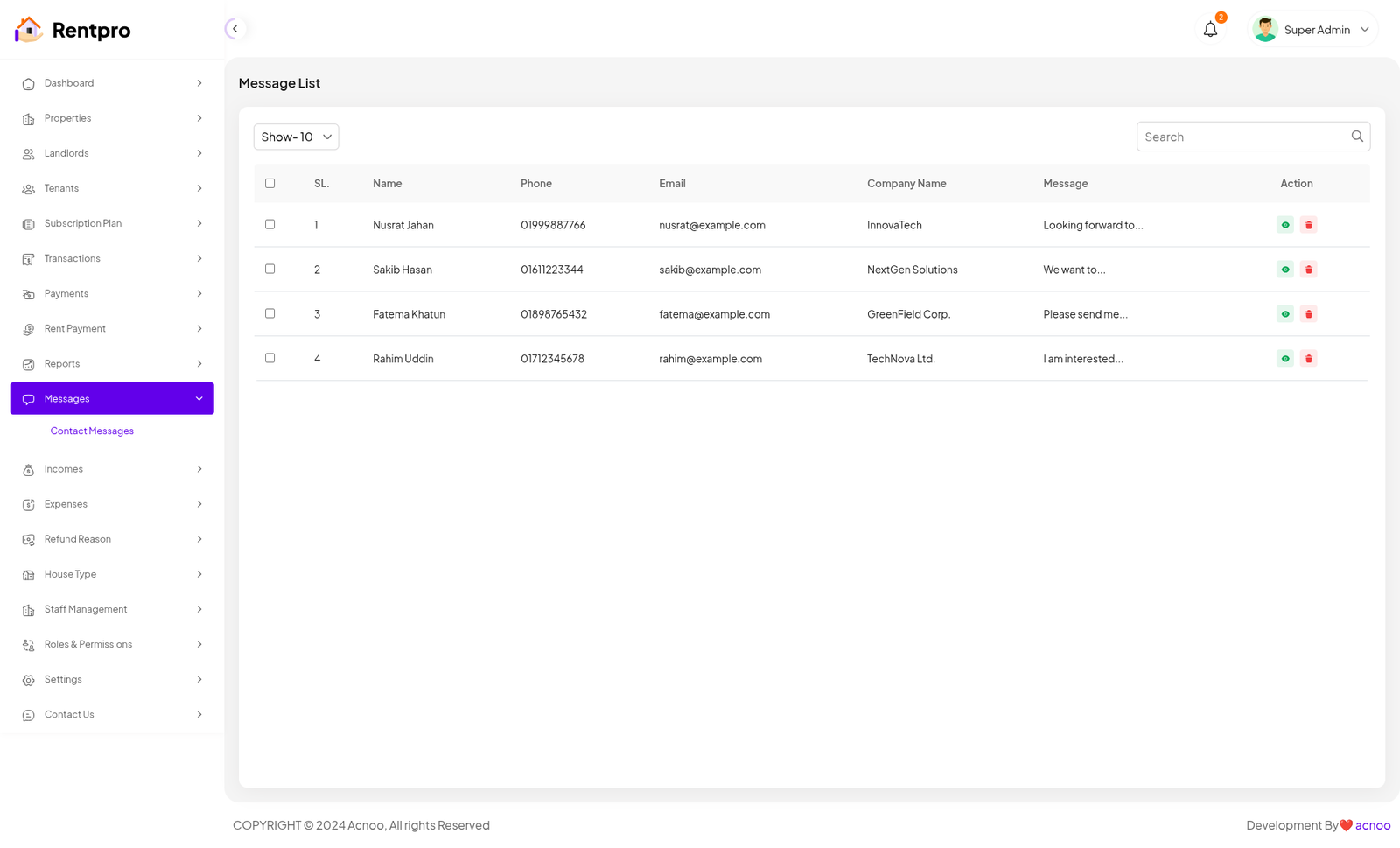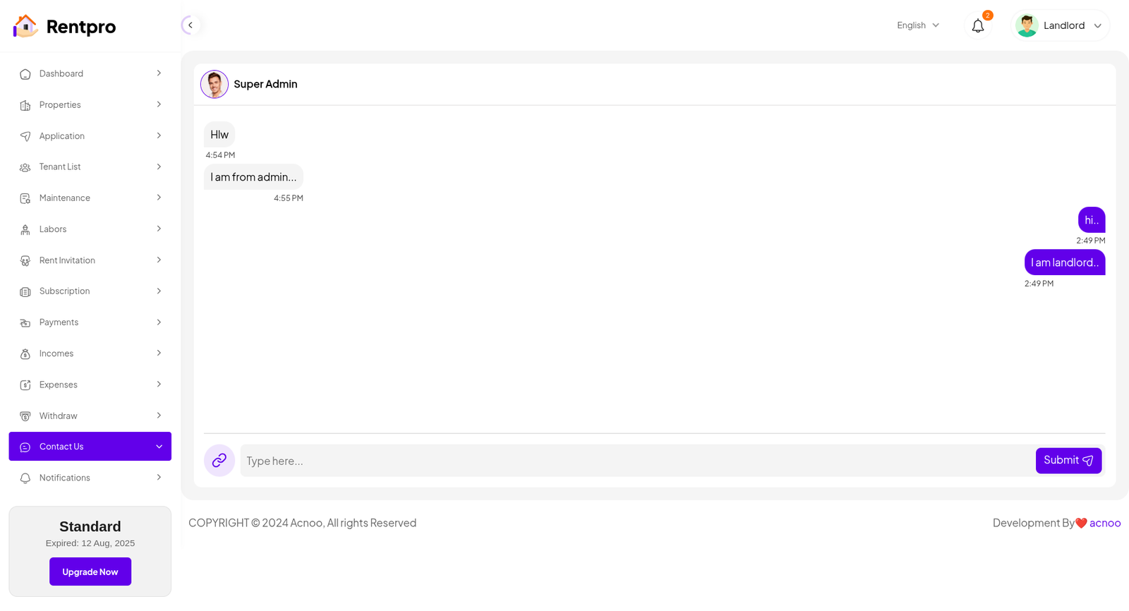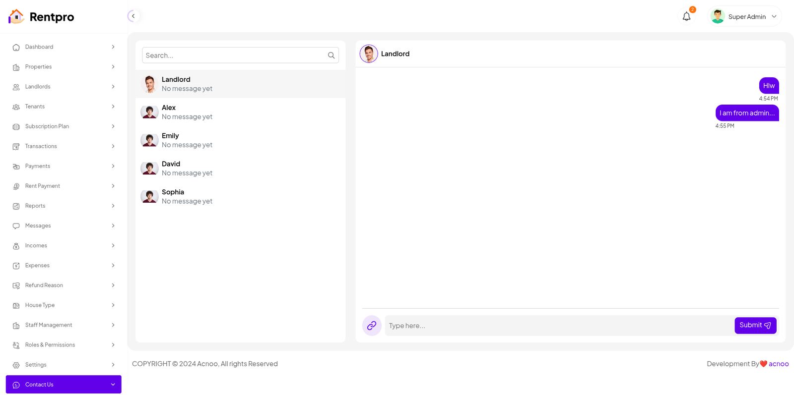 The "Contact Us" page, which appears to function as a live chat system, provides a direct communication channel between the user (in this case, the Landlord) and an administrator or support team (referred to as "Super Admin"). This feature is crucial for resolving issues, getting support, and communicating with the application's staff.