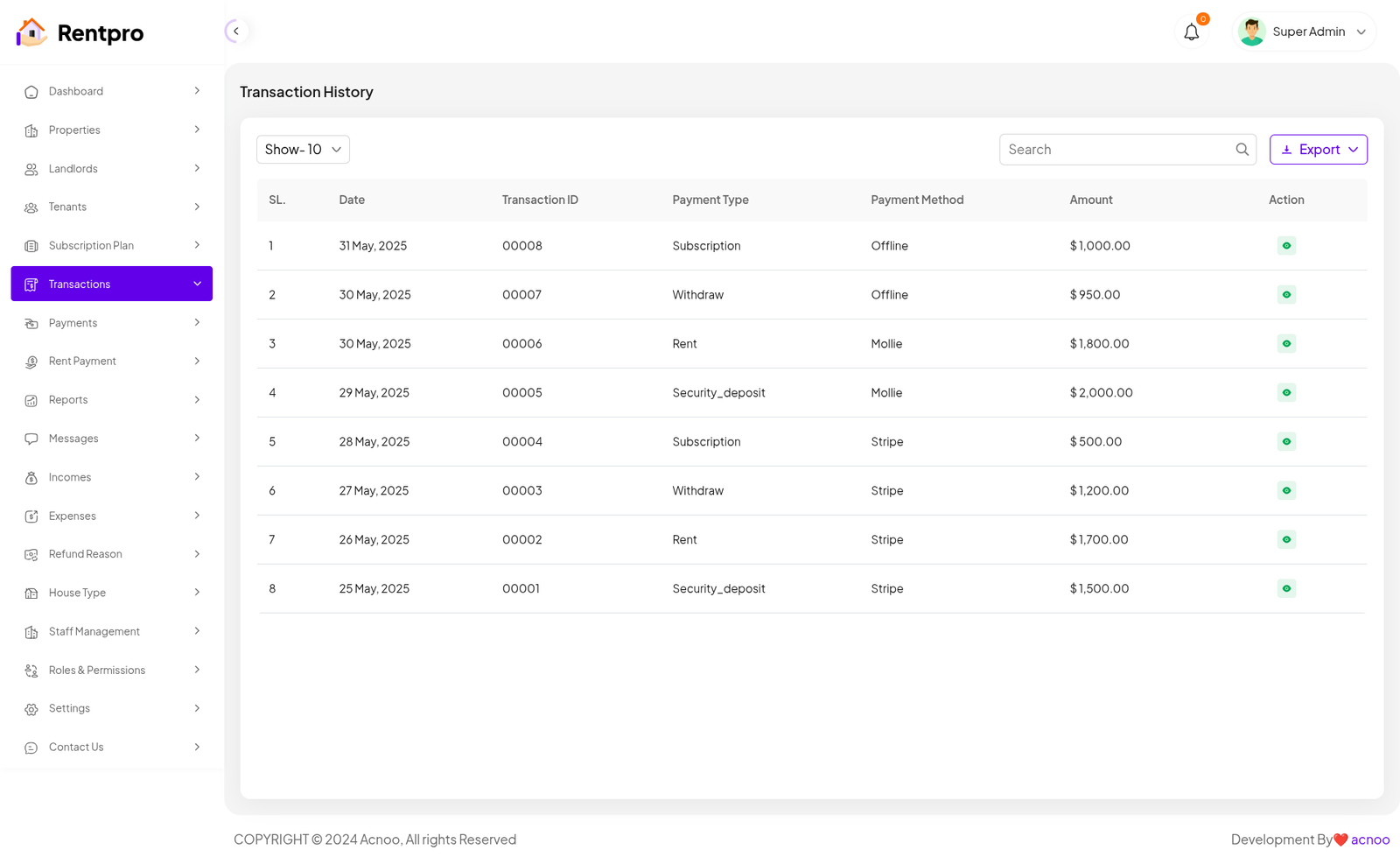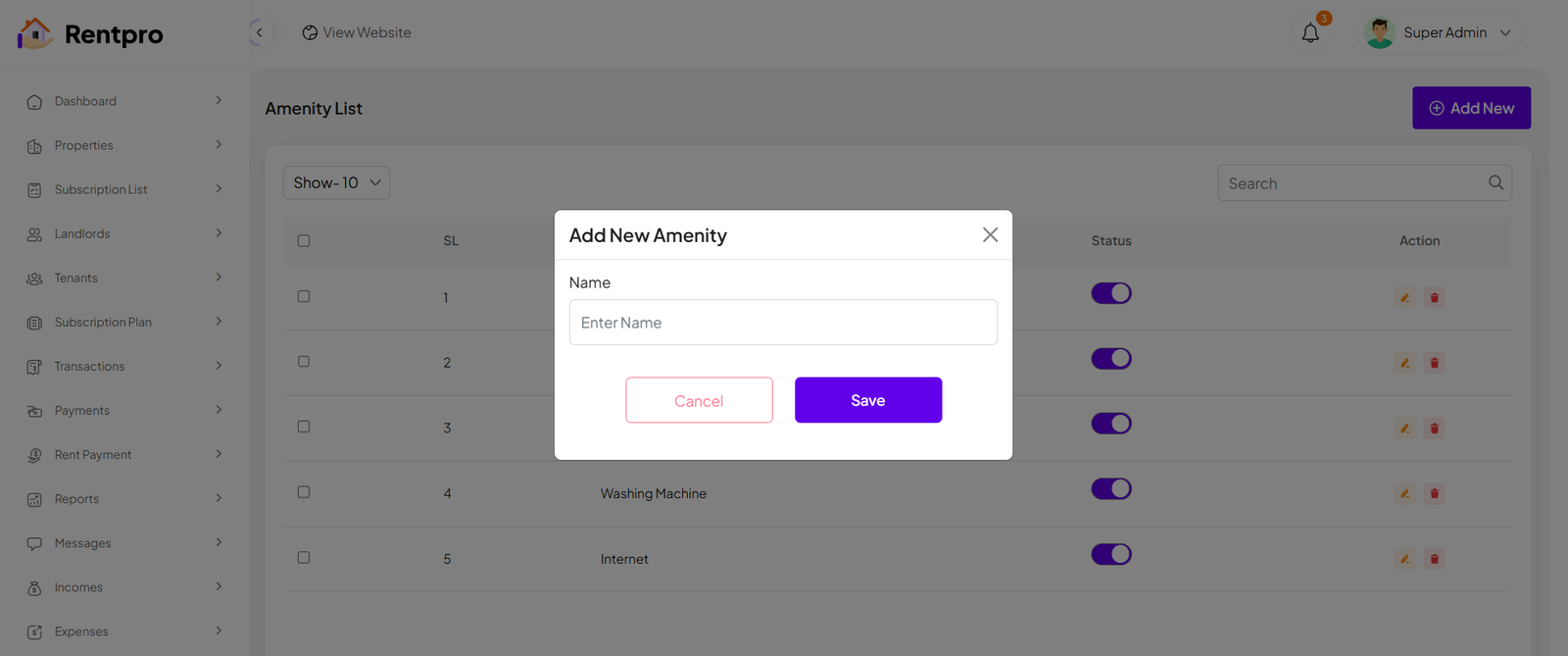 The "All Tenant" page in the Rentpro admin panel provides a comprehensive list of all tenant accounts registered on the platform. This centralized view enables administrators to manage tenant details, monitor their account status, and perform necessary actions.