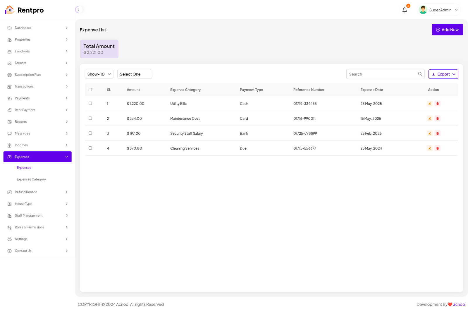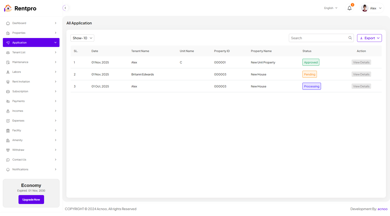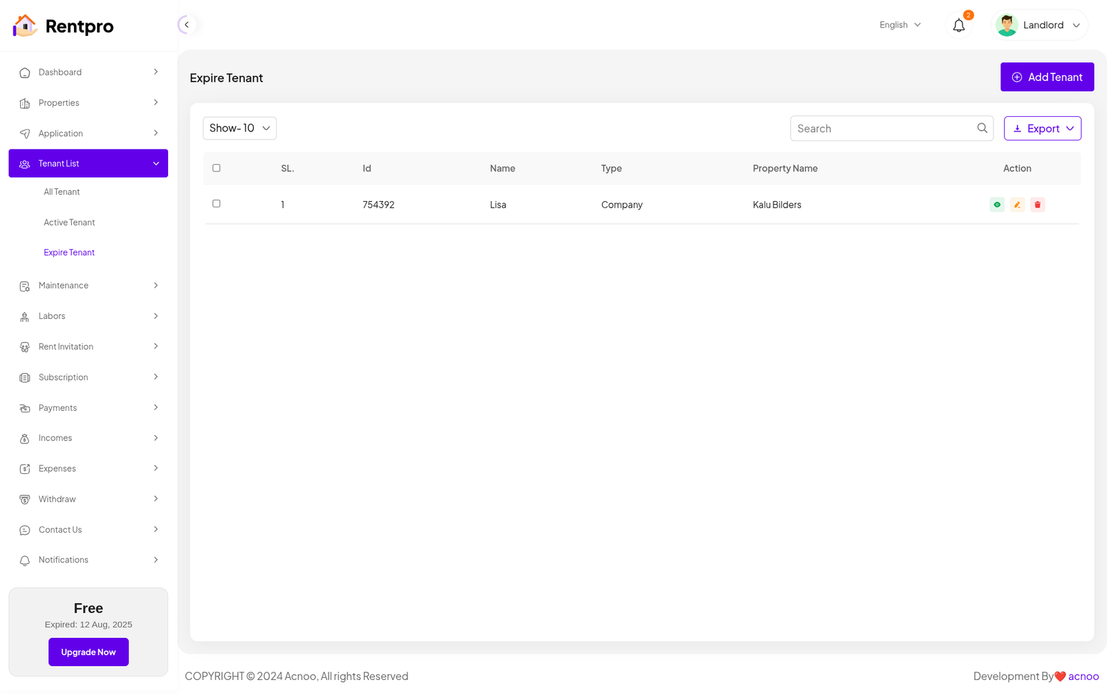 The "Expired Tenant" page lists tenants whose rental agreements have ended or whose accounts are no longer active. This list helps in tracking former tenants.