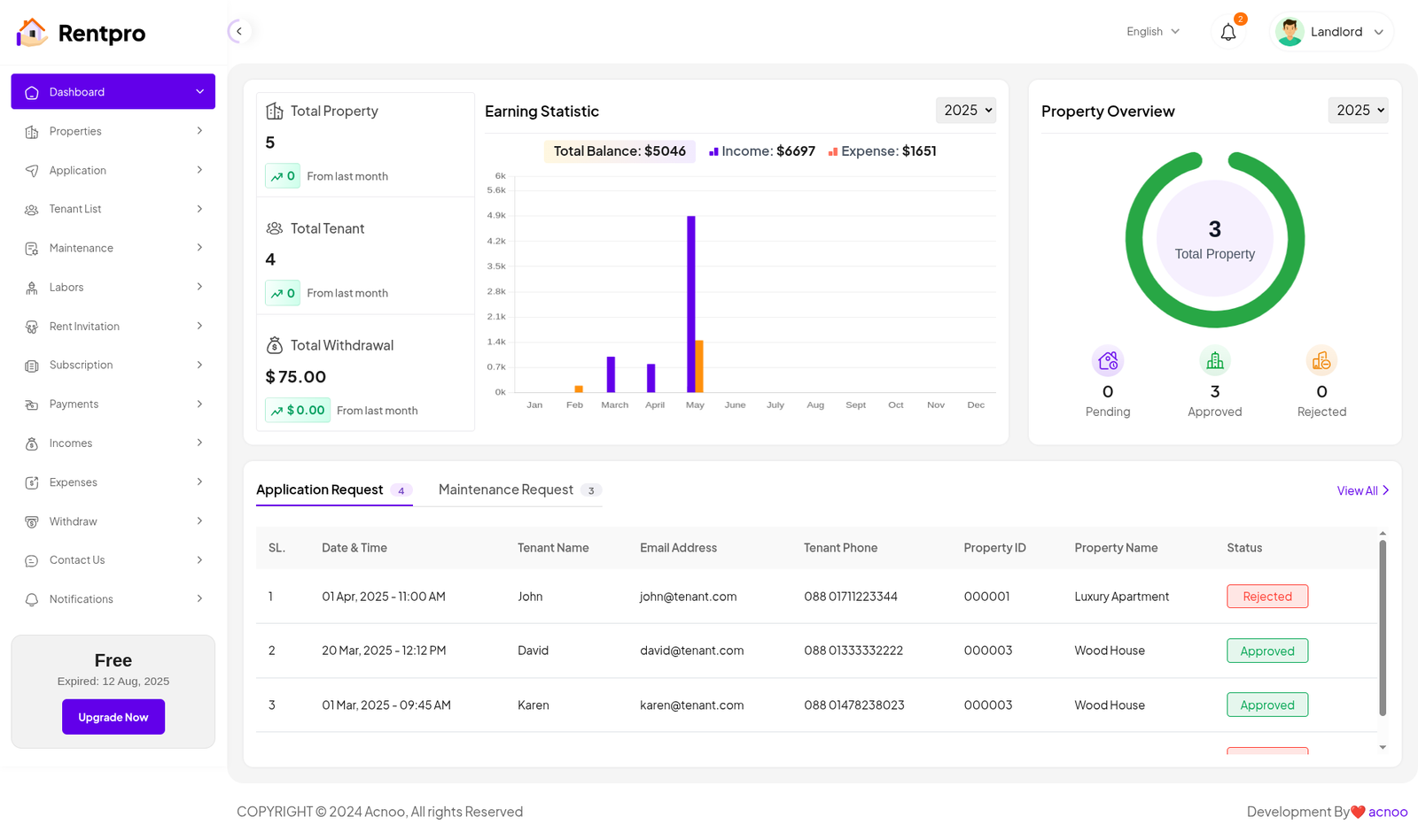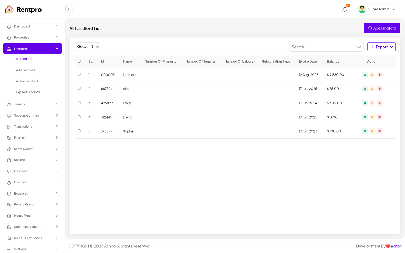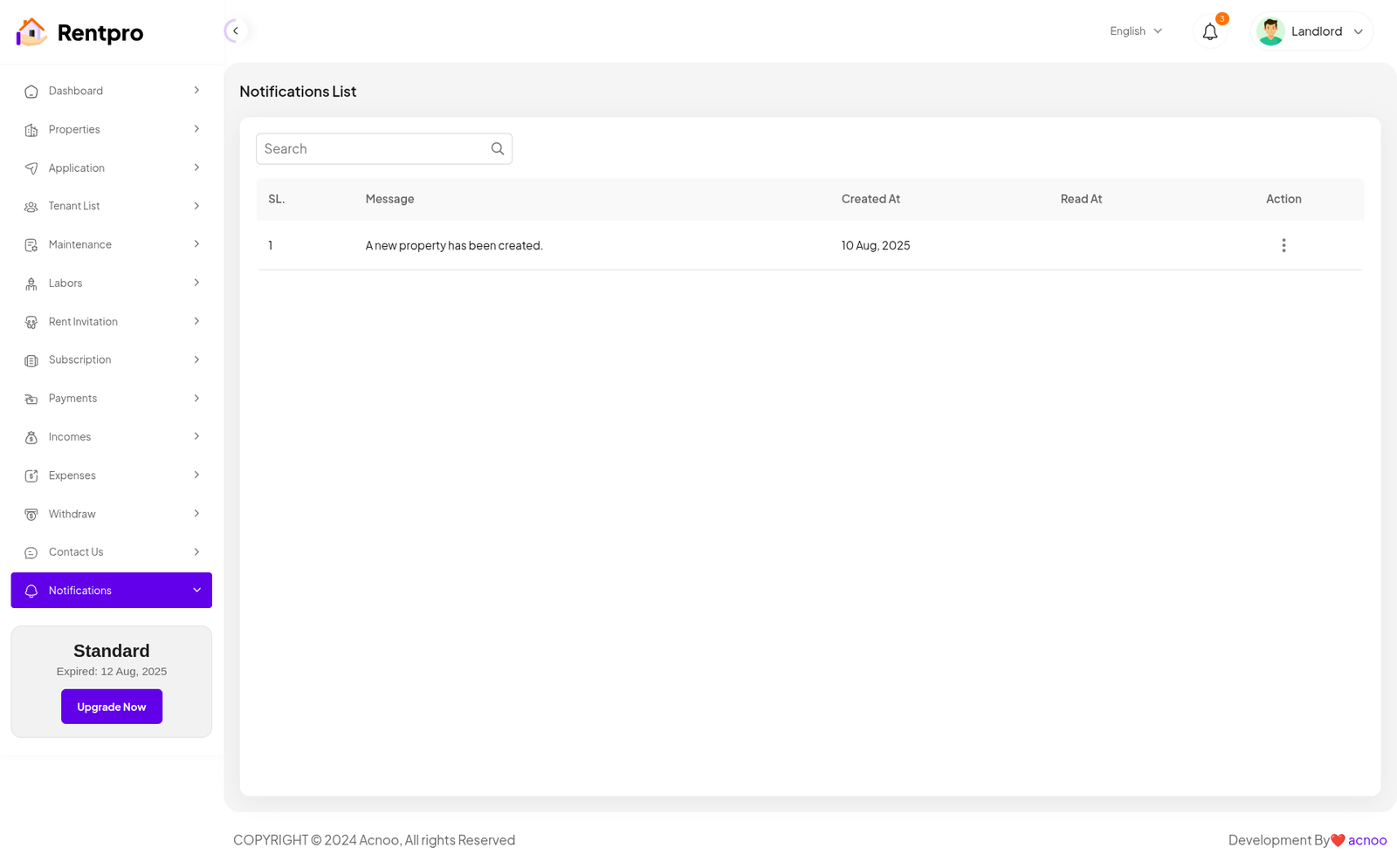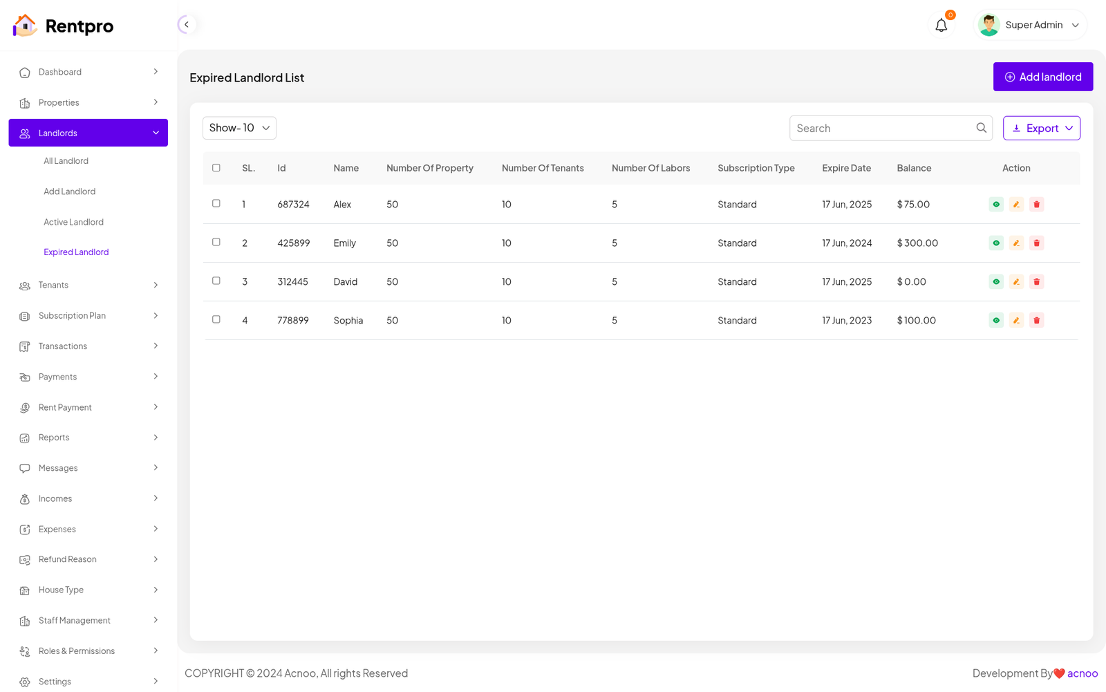 The "Expired Landlord List" page is dedicated to landlords whose subscription plans have ended. These landlords are no longer actively using the platform and may have limited functionality.