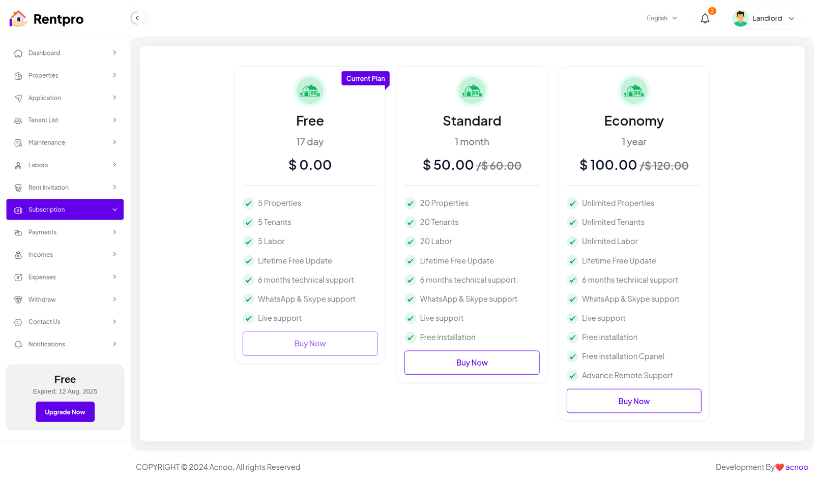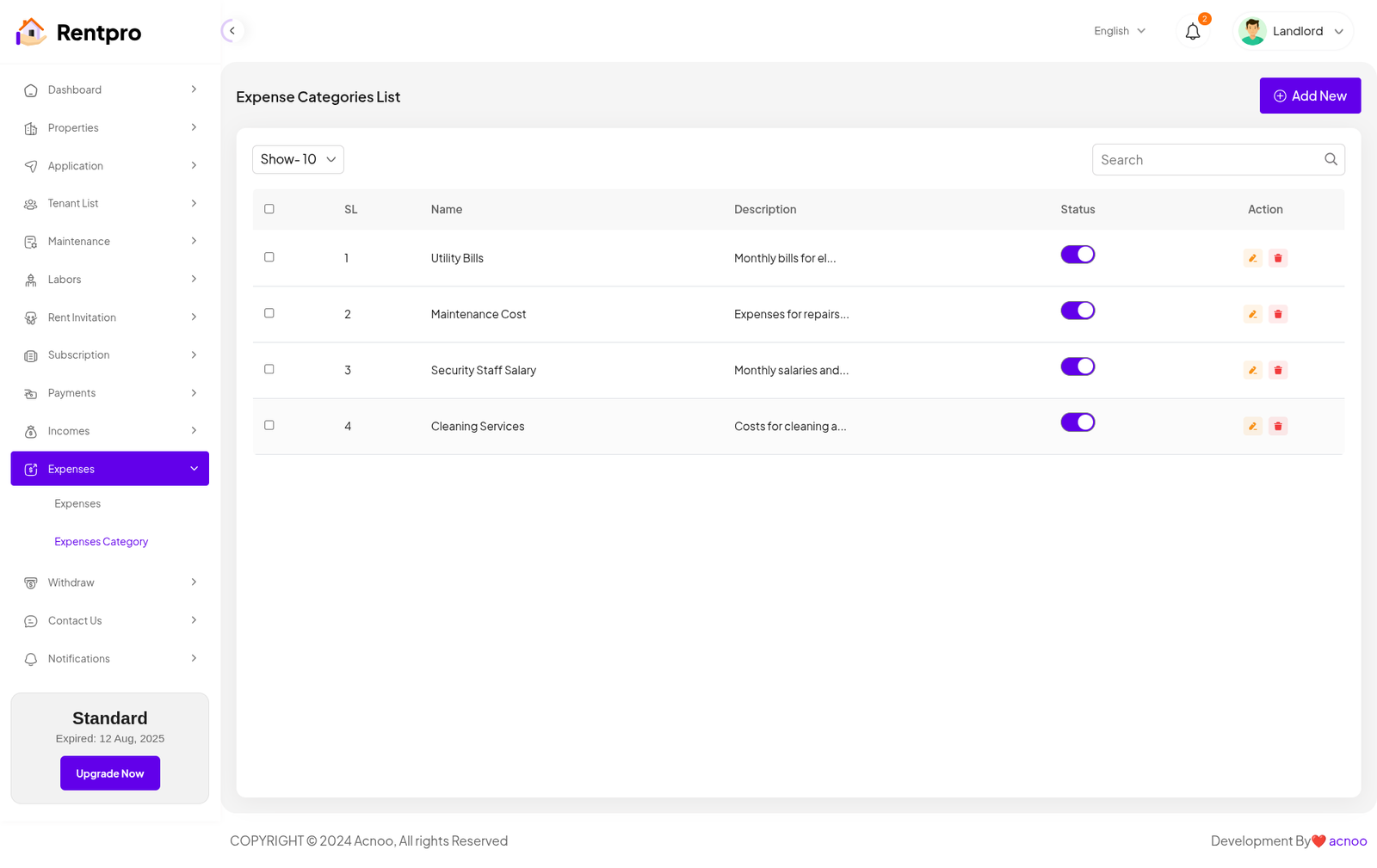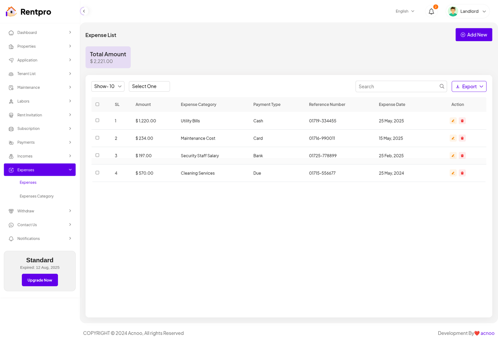 The "Expired Landlord List" page is dedicated to landlords whose subscription plans have ended. These landlords are no longer actively using the platform and may have limited functionality.