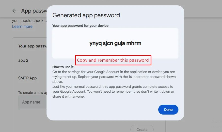 5. Google will show you a 16-character password — copy it. You’ll use this as your SMTP password