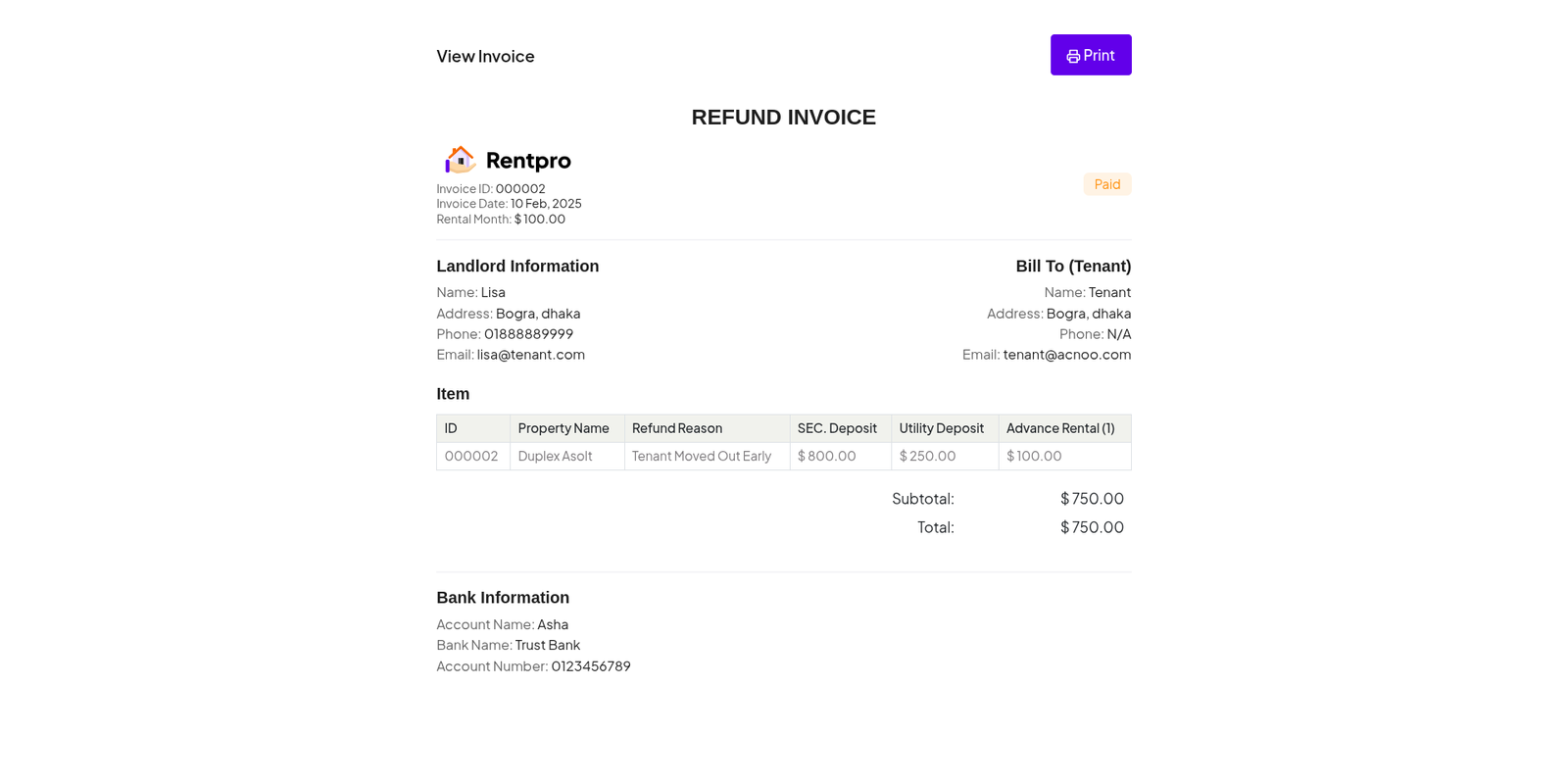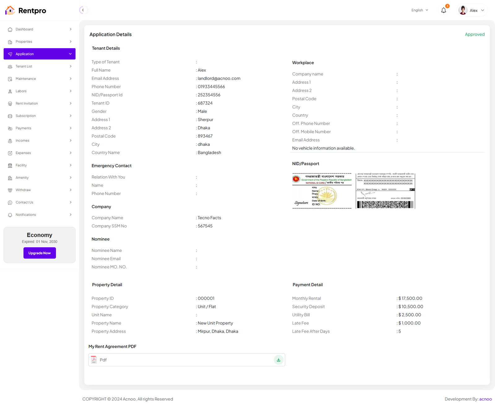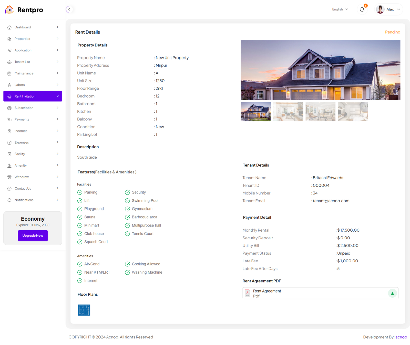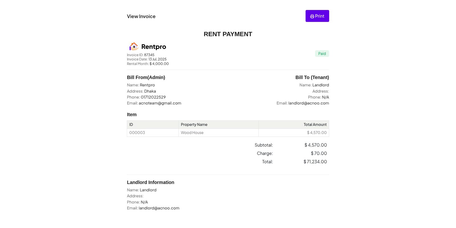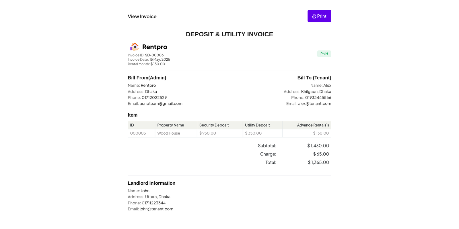 The "Rent Details" page provides a comprehensive, read-only view of a single rental invitation. It consolidates all information regarding a specific property, the prospective tenant, the financial terms, and associated documents into a single screen. This page is accessed by clicking the "View Details" button from the "Rent Invitation" list.