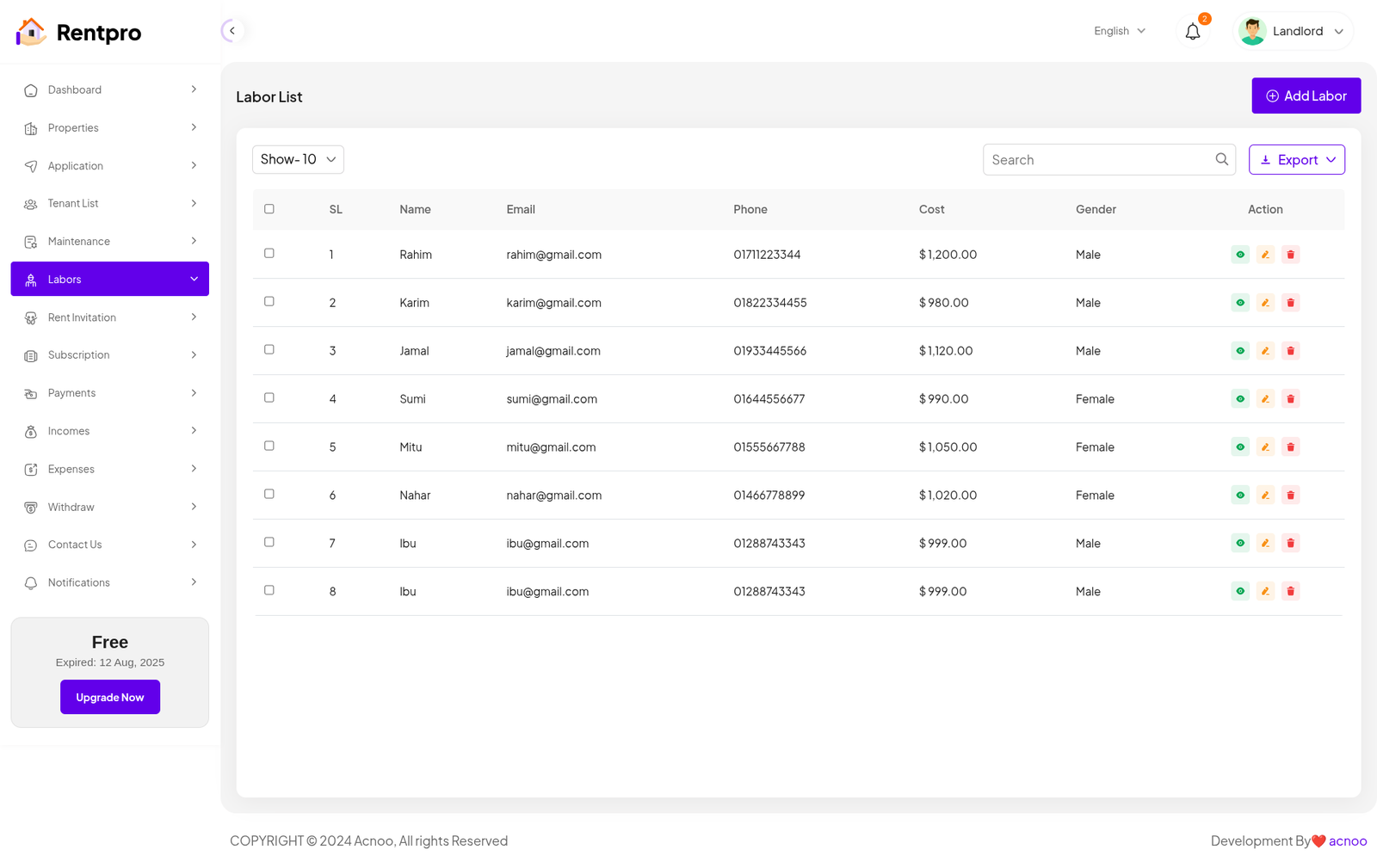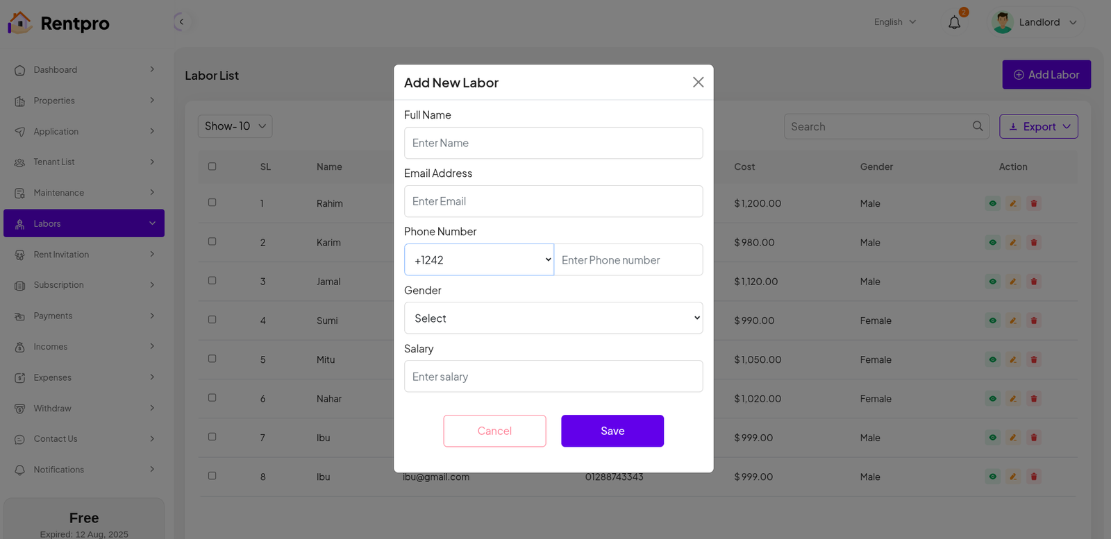 The "Labor List" page serves as a directory of all laborers or contractors available for maintenance and repair jobs. It allows a landlord or property manager to manage their contact list of service providers, including their personal information and typical costs.