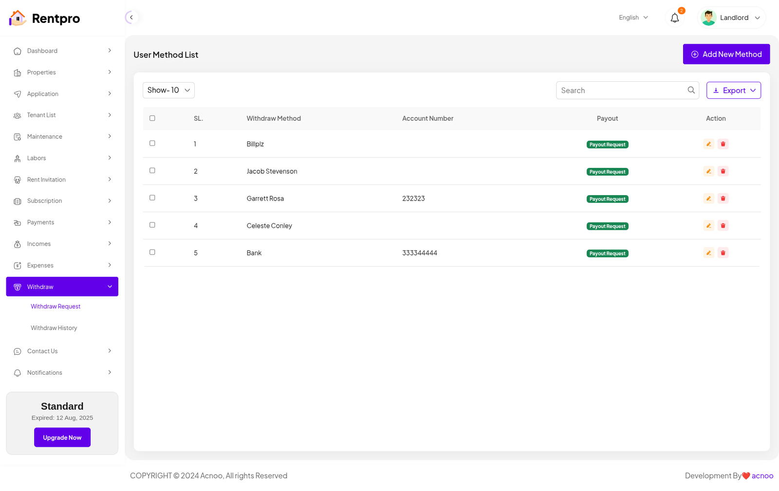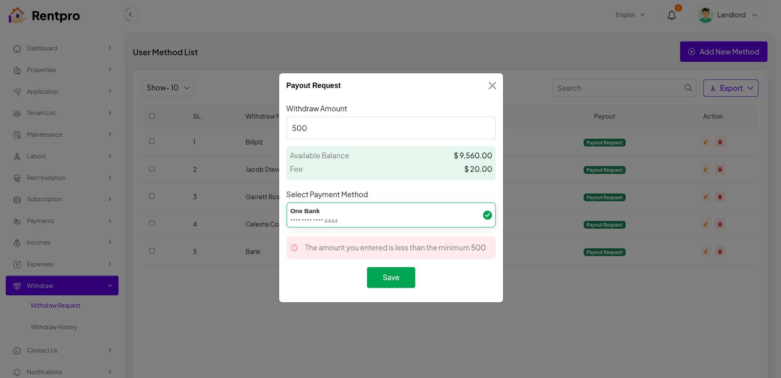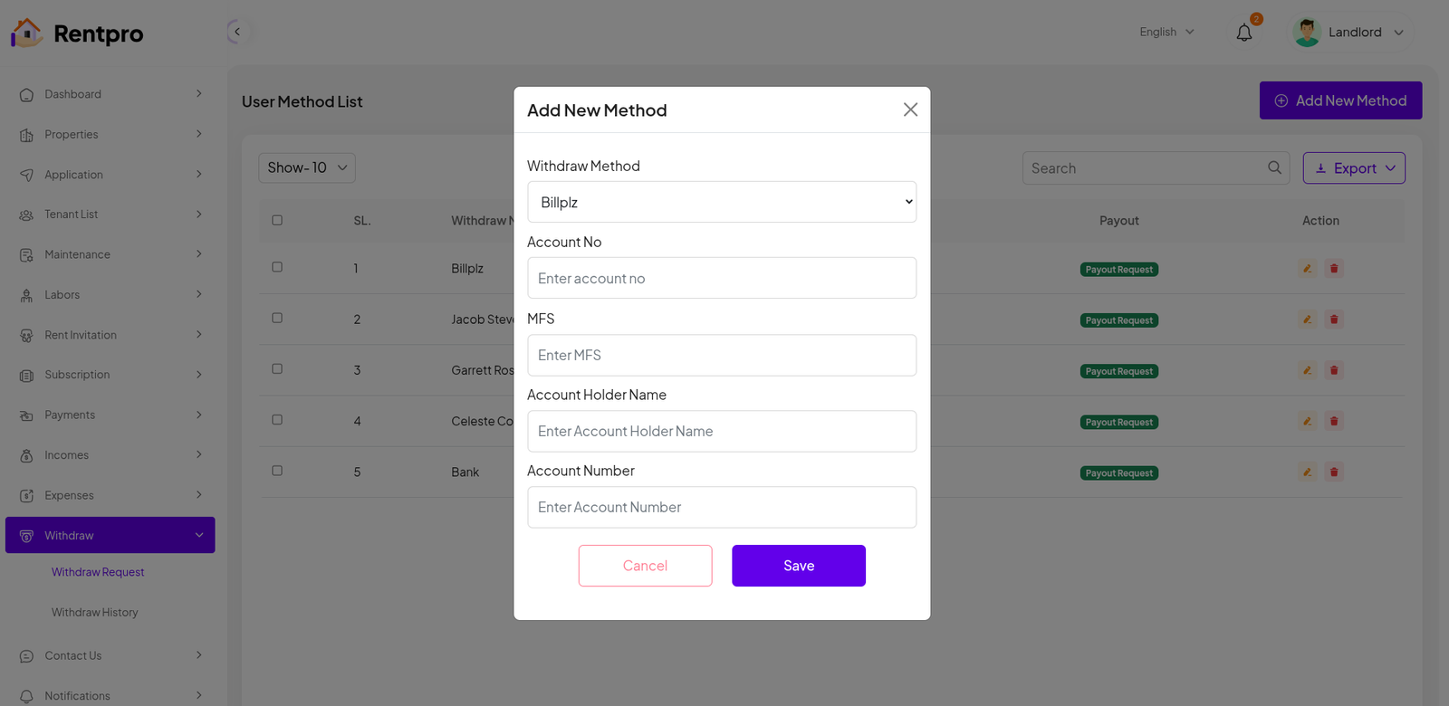 The "Add New Method" modal allows a user to securely add a new method for withdrawing funds from their Rentpro account. This is a critical step for a landlord to receive income from rent and other payments.