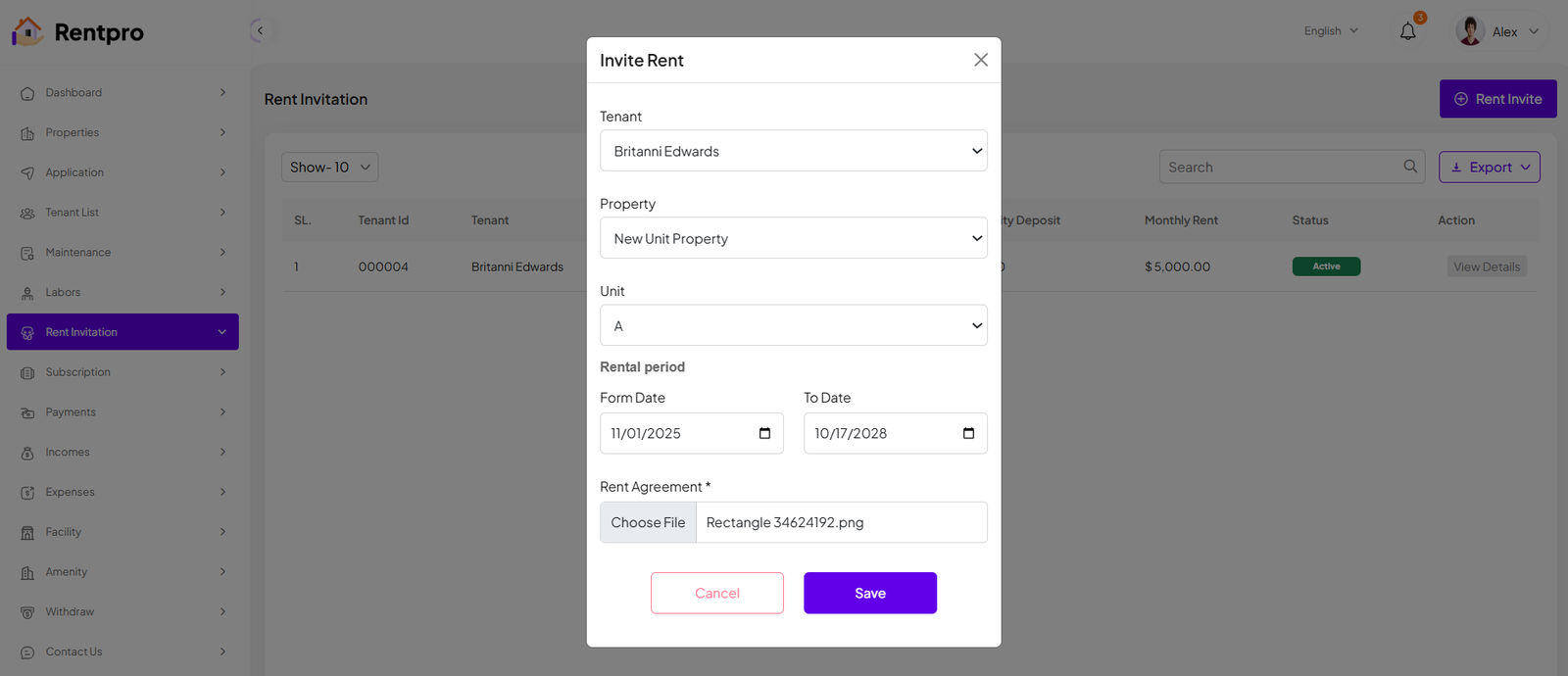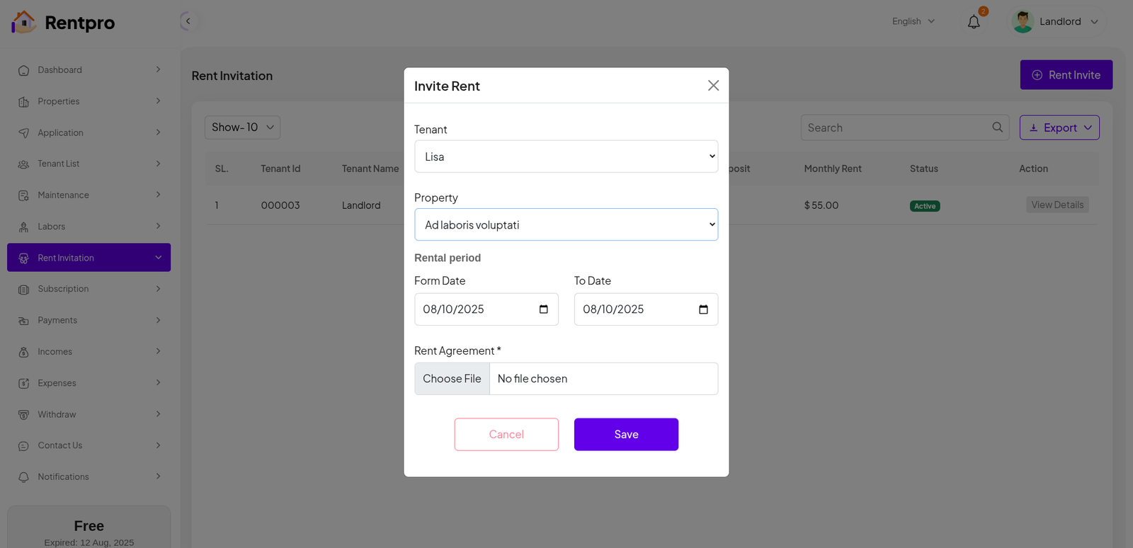 The "Invite Rent" modal allows a landlord or property manager to create and send a formal rental invitation to a prospective tenant. When you select a property with the "Unit/Flat" category, a new Unit field will appear, which must be filled in. This feature is used when the landlord initiates the rental process, as opposed to waiting for a tenant-submitted application.