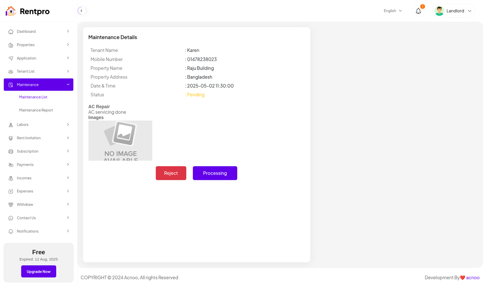The "Maintenance Details" page provides a focused, single-view of a specific maintenance request. It allows a landlord to review all the information submitted by the tenant regarding the issue and manage the status of the repair. This page is accessed by clicking the "View Details" button from the "Maintenance List" page.