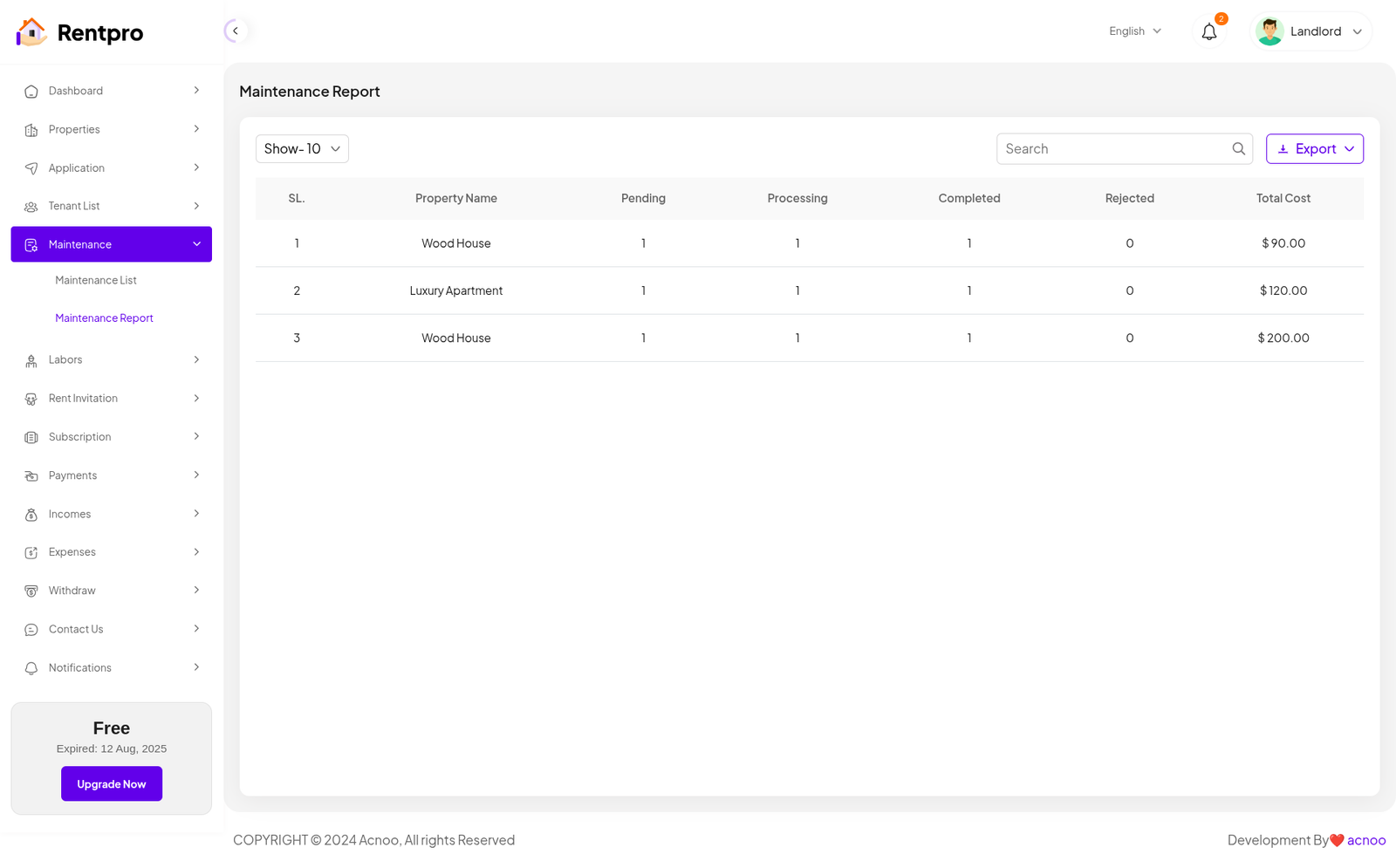 The "Maintenance Report" page provides an aggregated summary of maintenance activities, broken down by property. It offers a high-level overview of the status and costs of all maintenance requests.