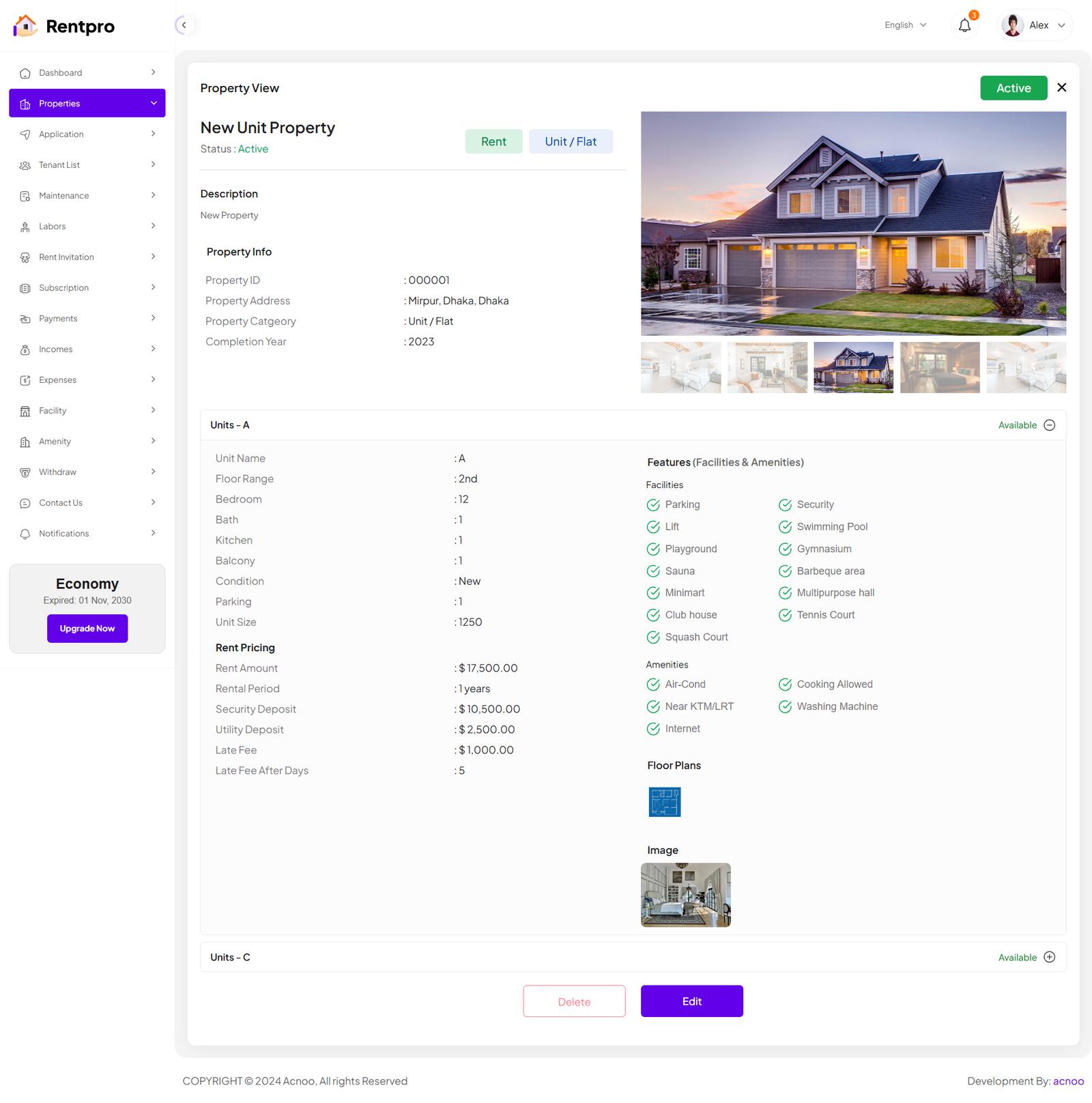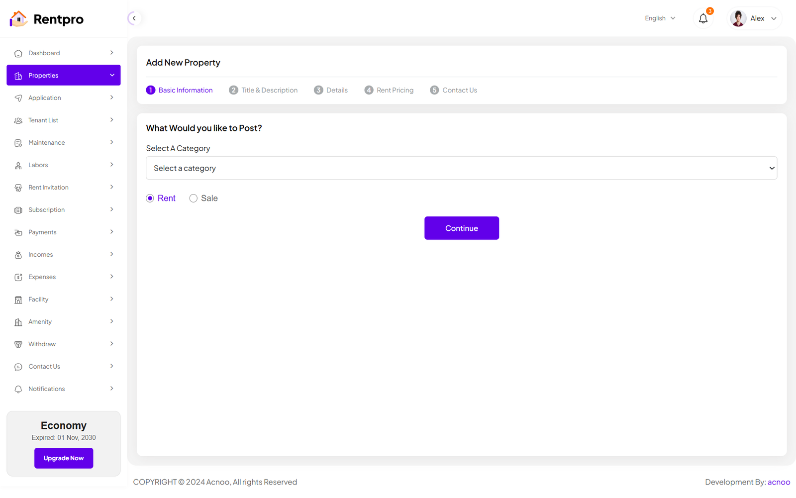By clicking on the "Add property" button, you can create a new property. You will need to fill in the necessary fields. Here is the screenshot of the Create Property page. In the first screenshot, the input fields will change according to the selected category. Specifically, if you select the "Unit/Flat" category, the input fields will change significantly. Additionally, in the first screenshot, there is a "Type" field with options "Rent" and "Sale." Selecting either of these will only affect the Rent Pricing section, while the rest of the fields will remain unchanged.
