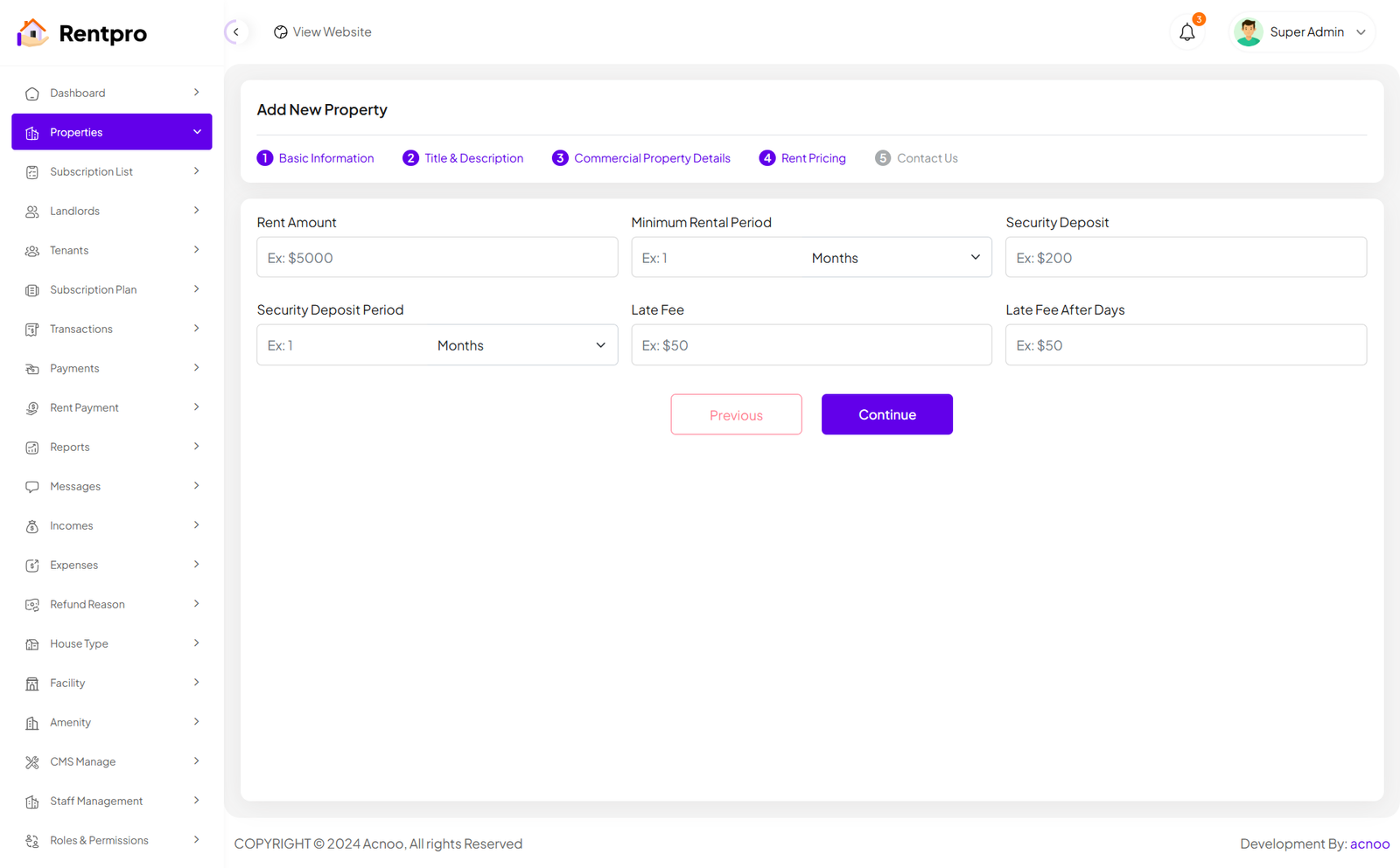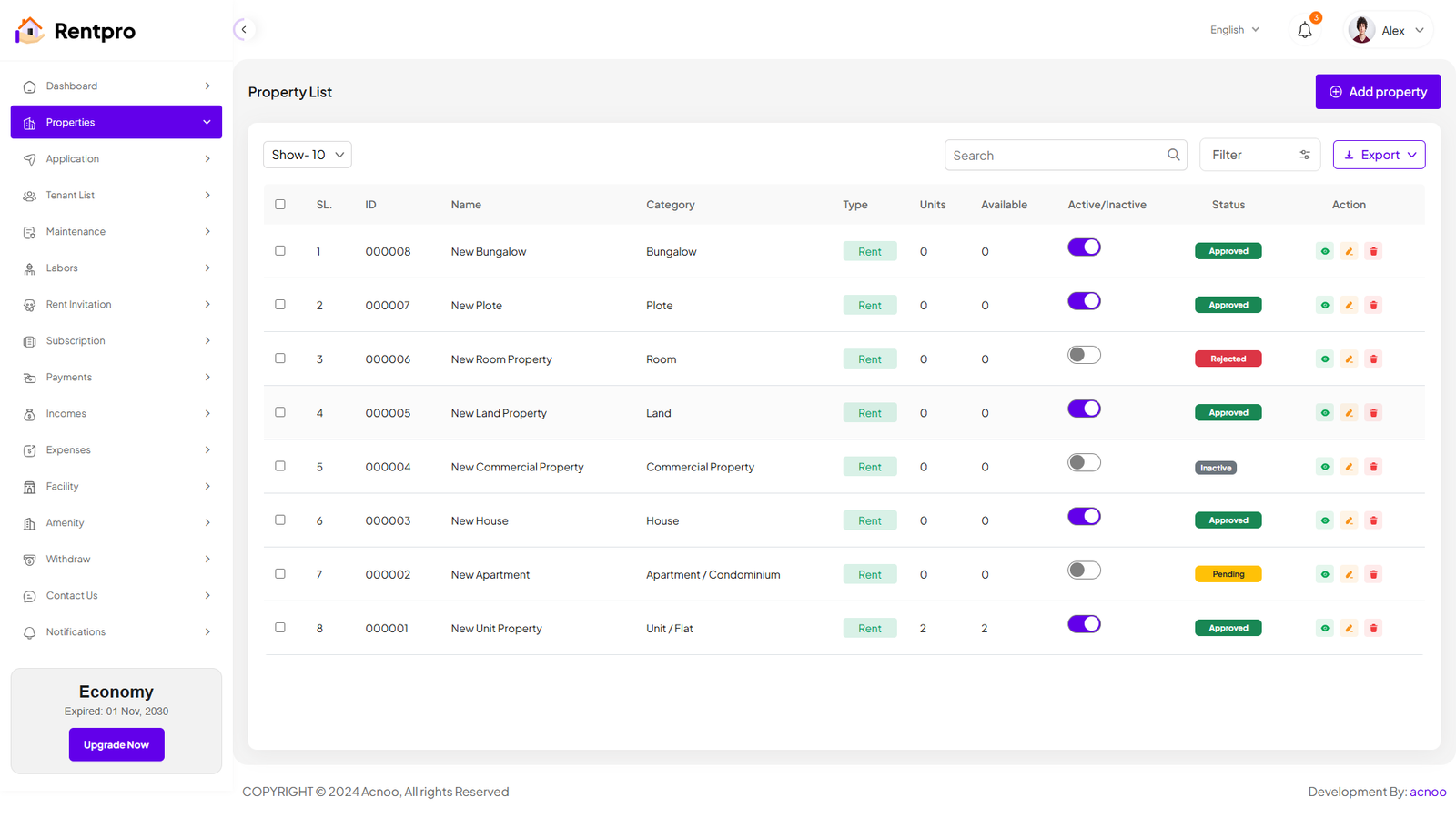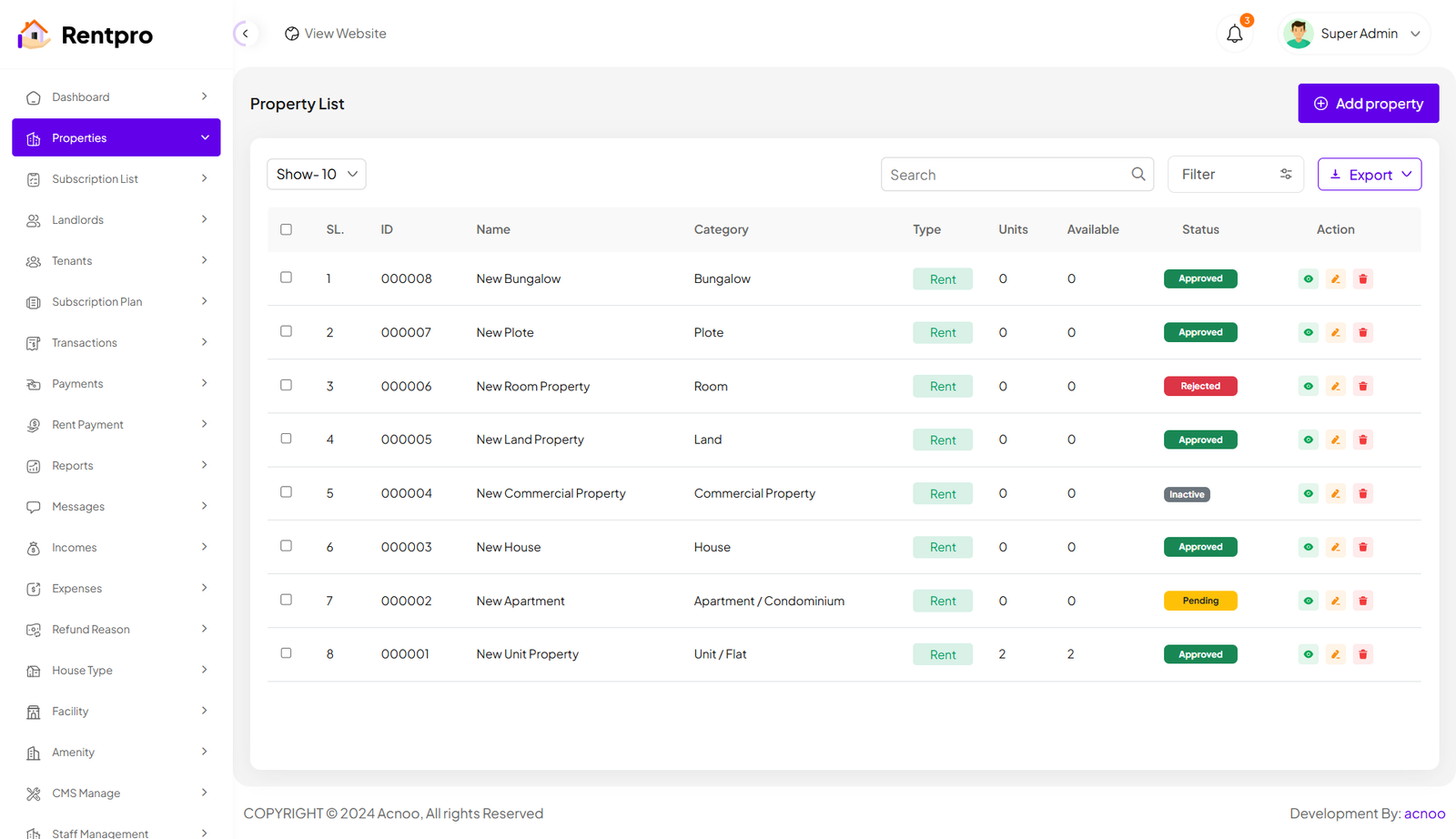 The "Properties" page in the Rentpro admin panel provides a centralized view and management interface for all properties listed on the platform. This page allows administrators to monitor property details, status, and perform administrative actions. By clicking the "View" button, you can see the details of each property. You can also create a new property by clicking the "Add Property" button. Below, we'll describe how you can create a new property.