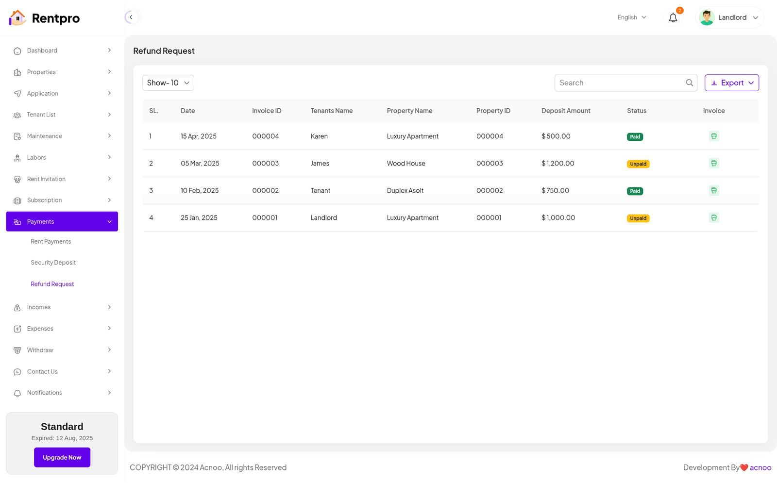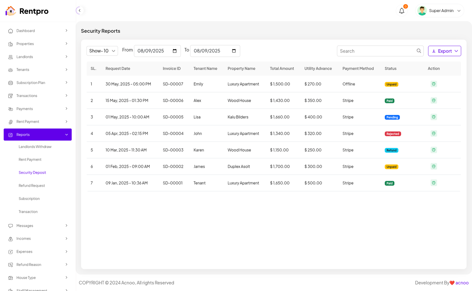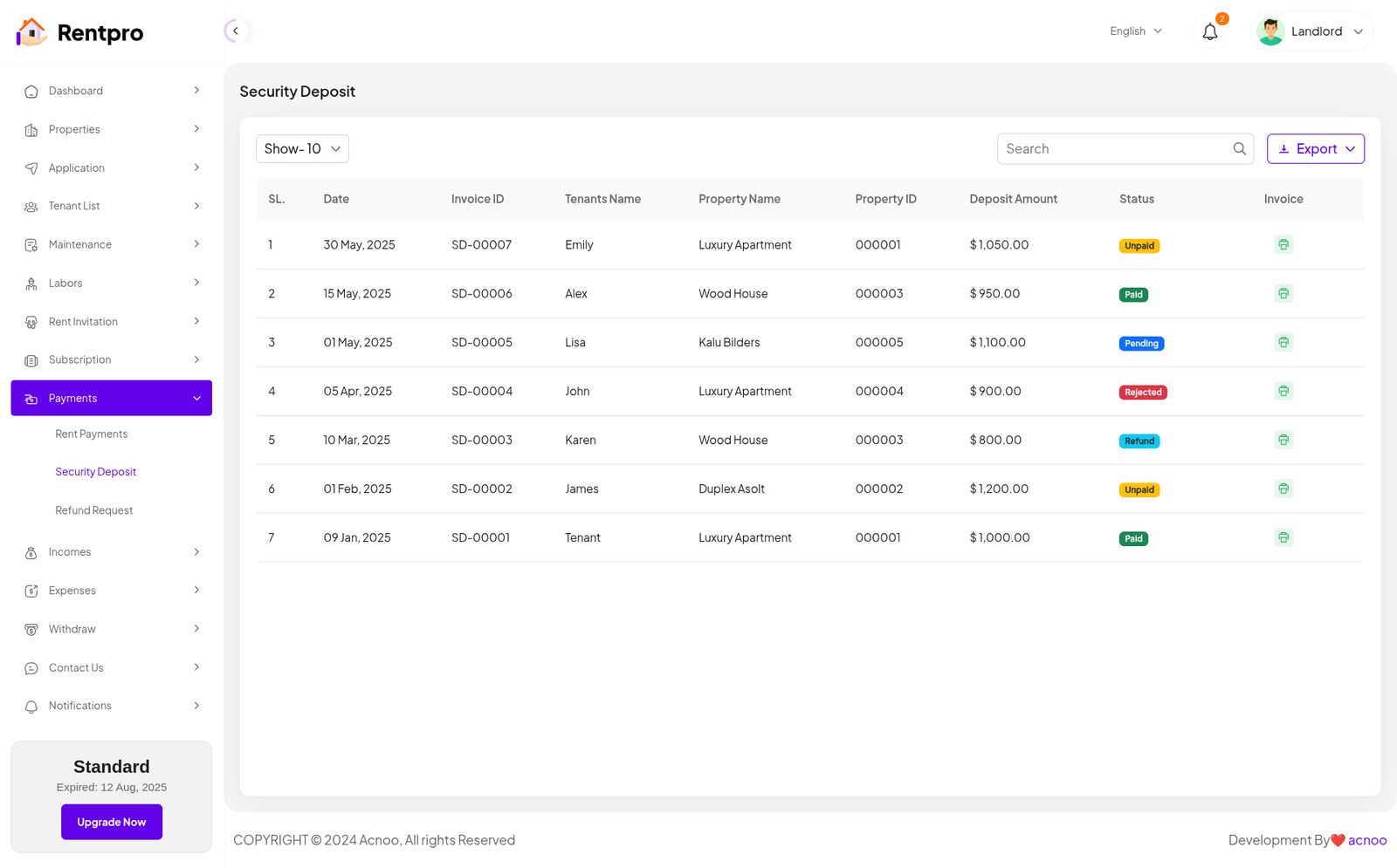 The "Security Deposit" page provides a centralized list and status tracker for all security deposits. It allows a landlord or property manager to monitor the status of each deposit (paid, unpaid, pending, or refunded) and access the associated invoice. This is a critical financial management tool for landlords