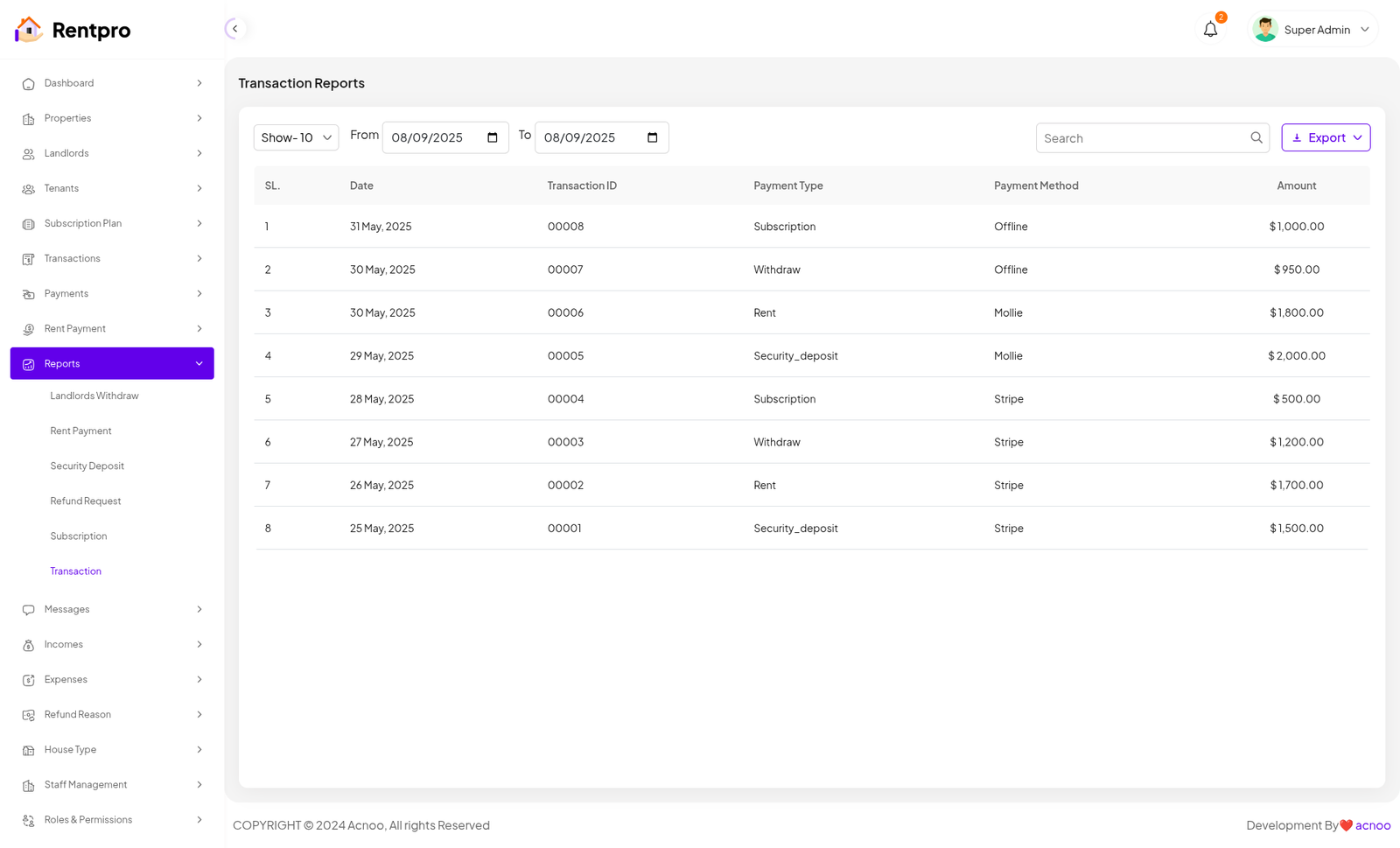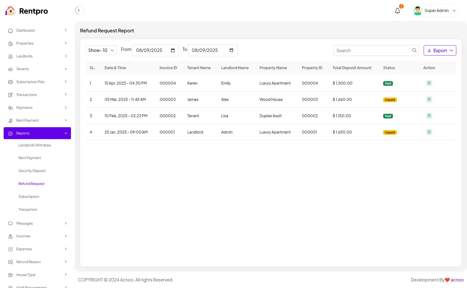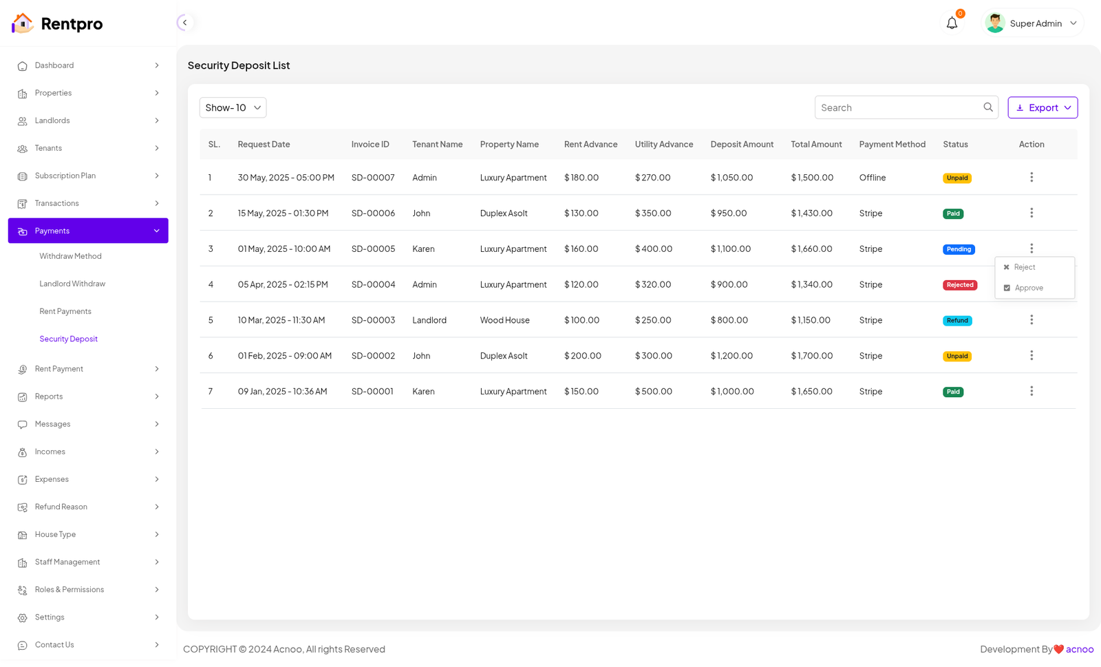 The "Security Deposit" page provides a centralized list and status tracker for all security deposits. It allows a landlord or property manager to monitor the status of each deposit (paid, unpaid, pending, or refunded) and access the associated invoice. This is a critical financial management tool for landlords