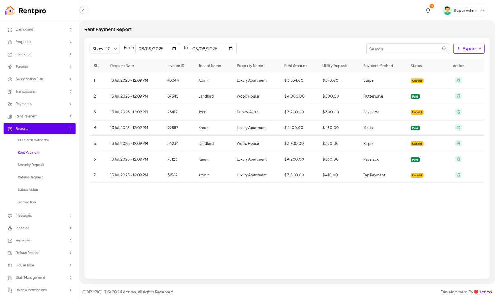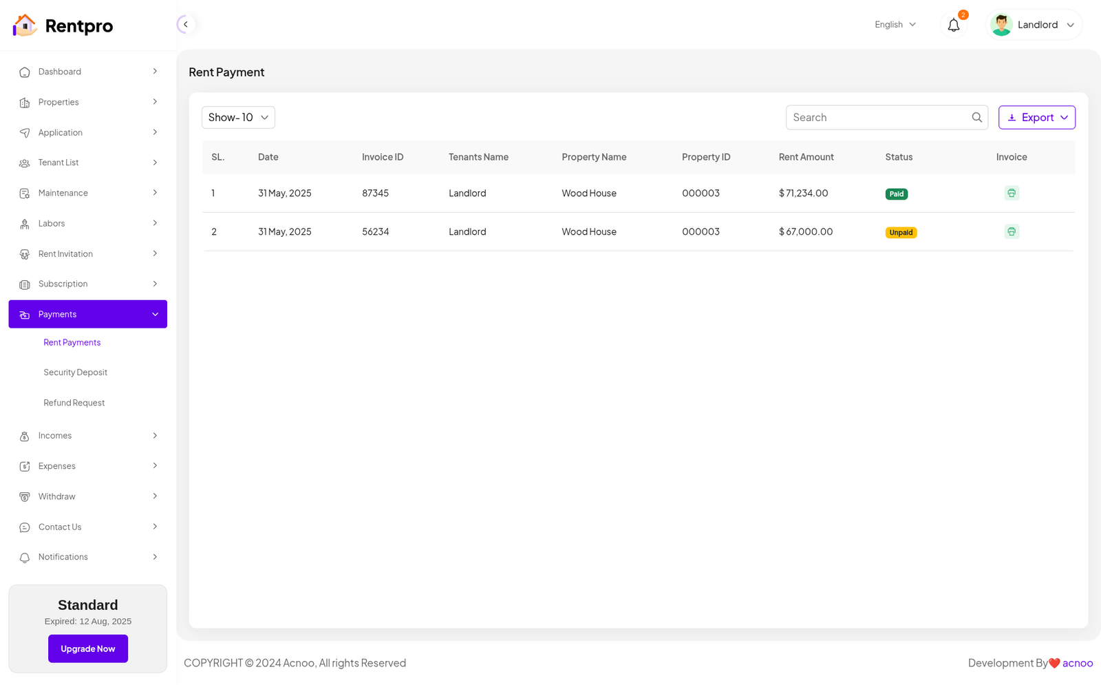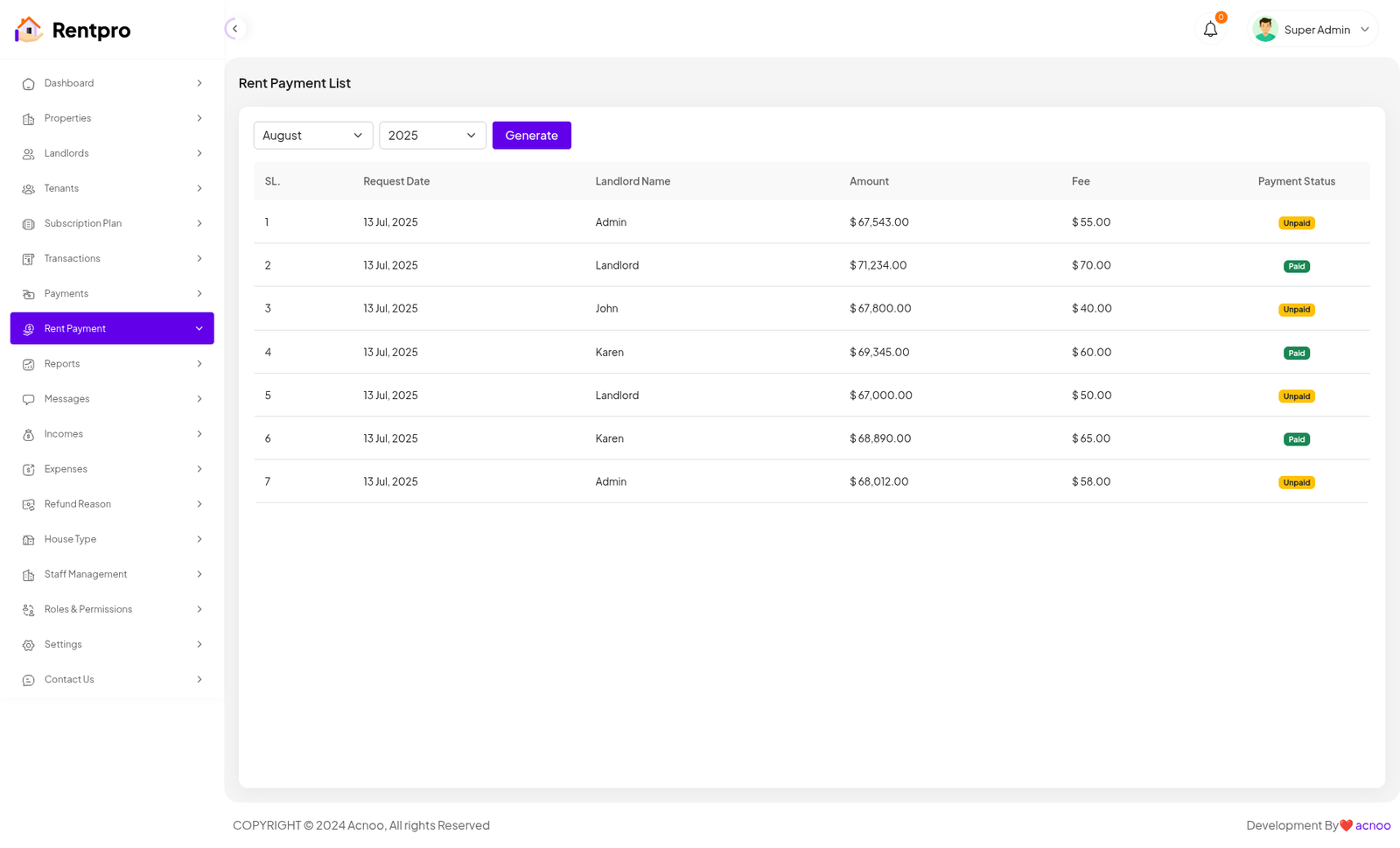 The "Rent Payment" page provides an administrative overview of all rent payments. It allows a landlord or property manager to track rent invoices, monitor their payment status (paid or unpaid), and access the details of each invoice.