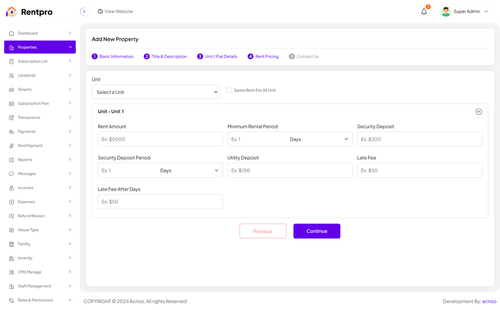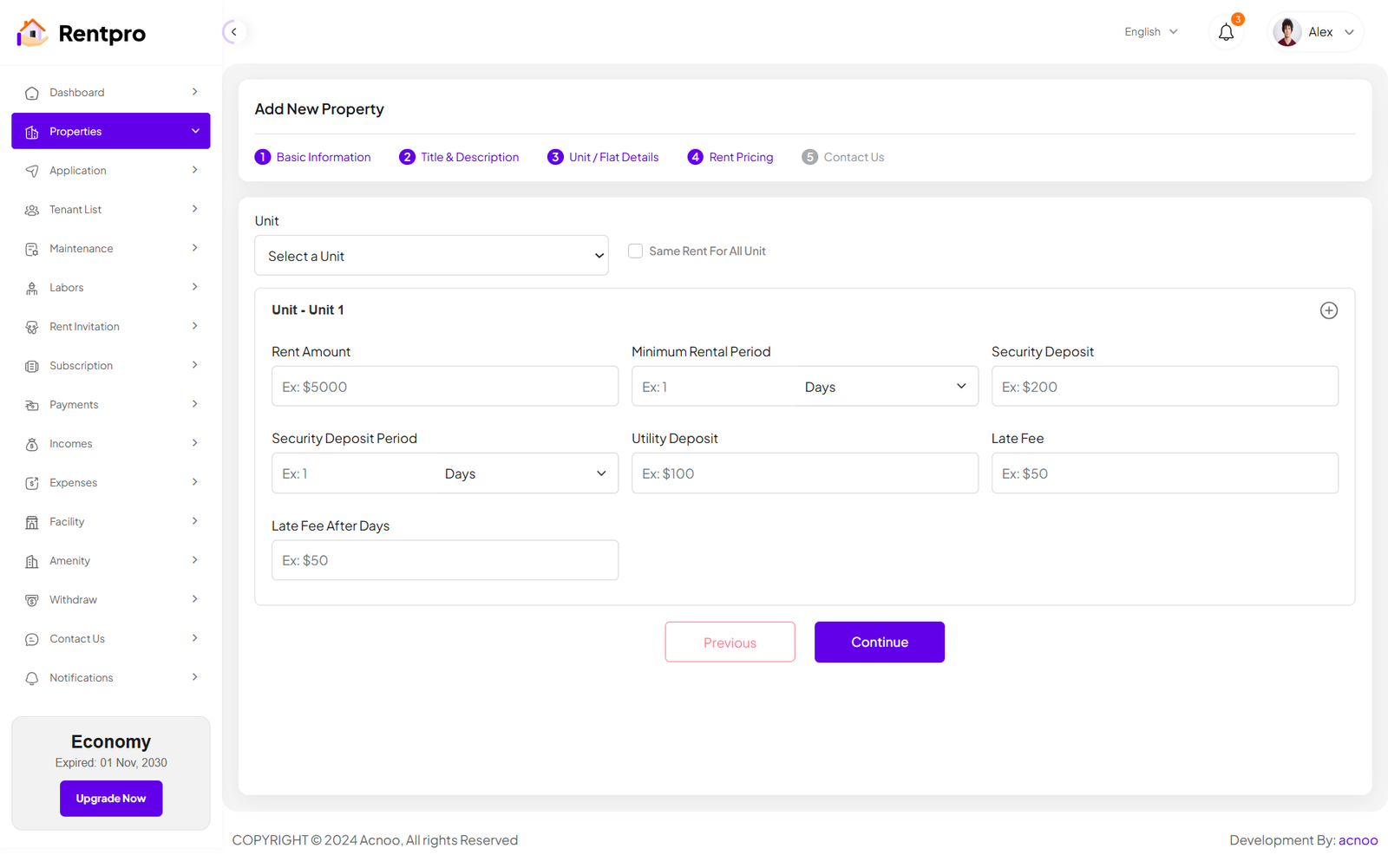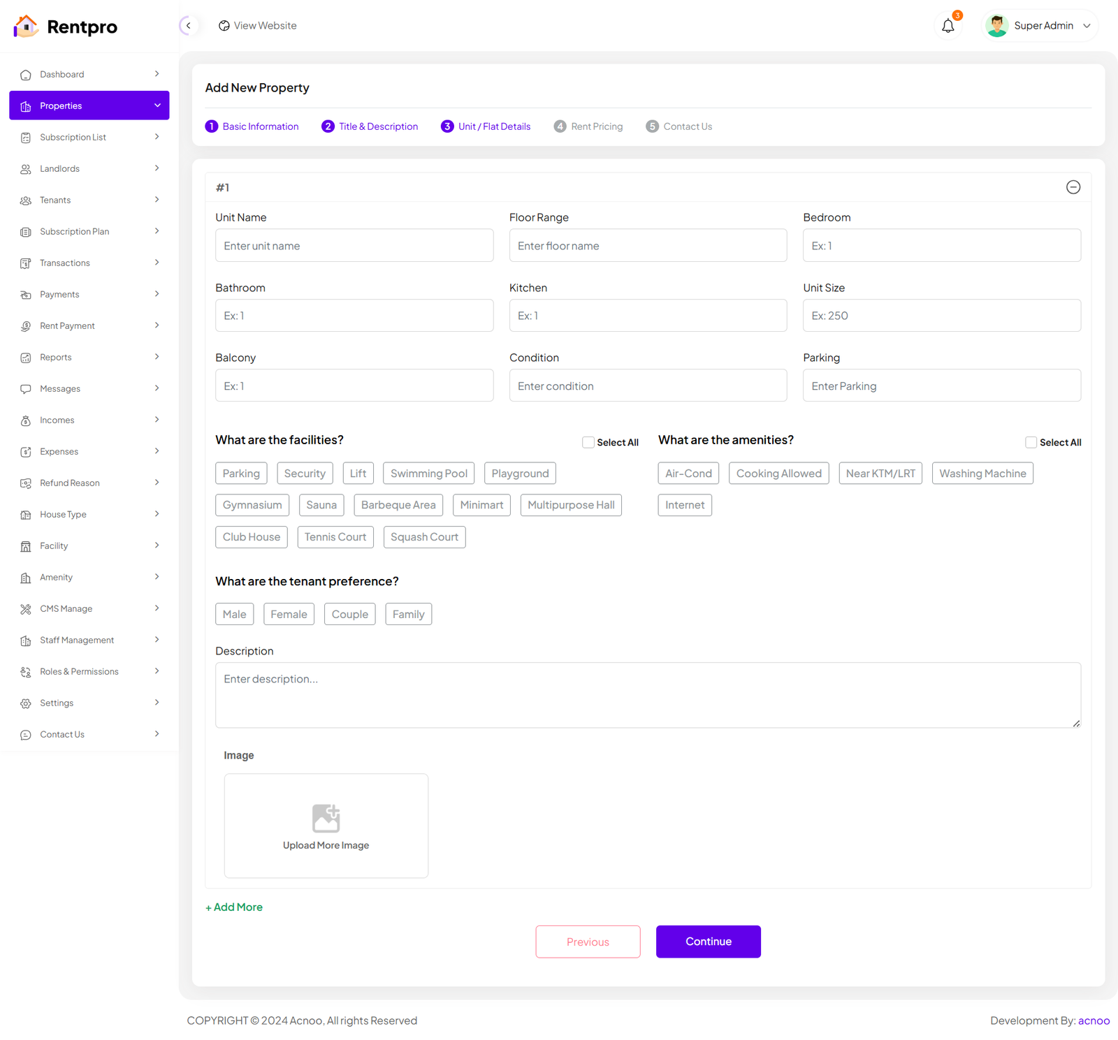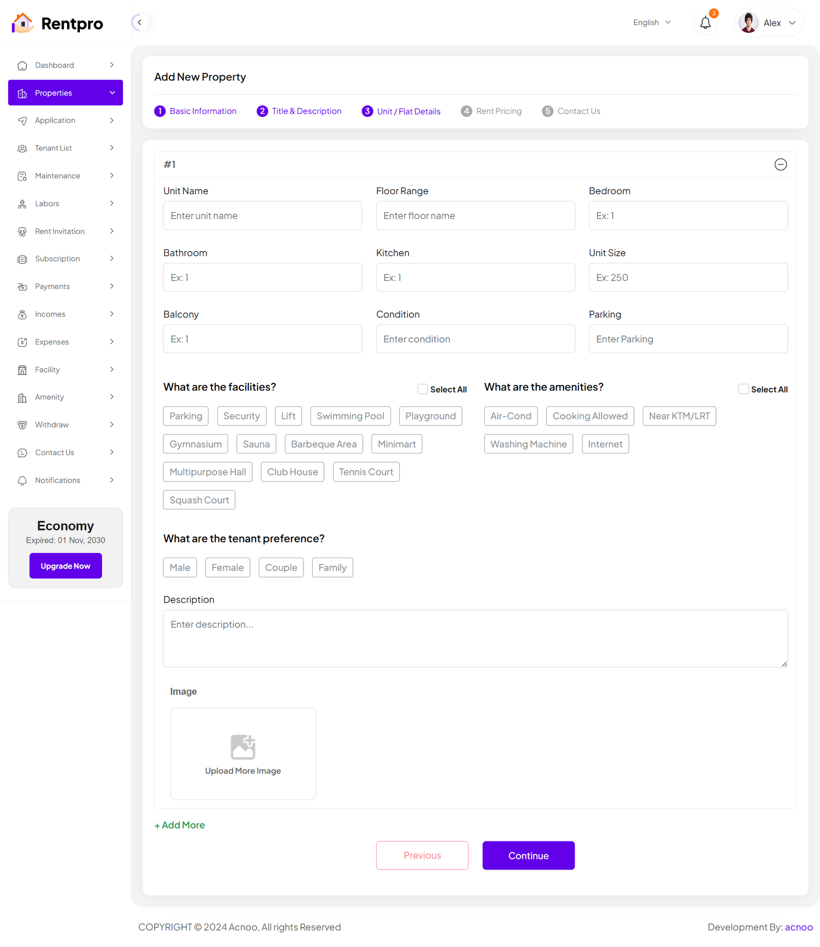 When the category is "Unit/Flat," the input fields on the Details and Pricing pages will update accordingly. Additionally, you can click the green "Add More" button to add more units as needed, according to your preference.