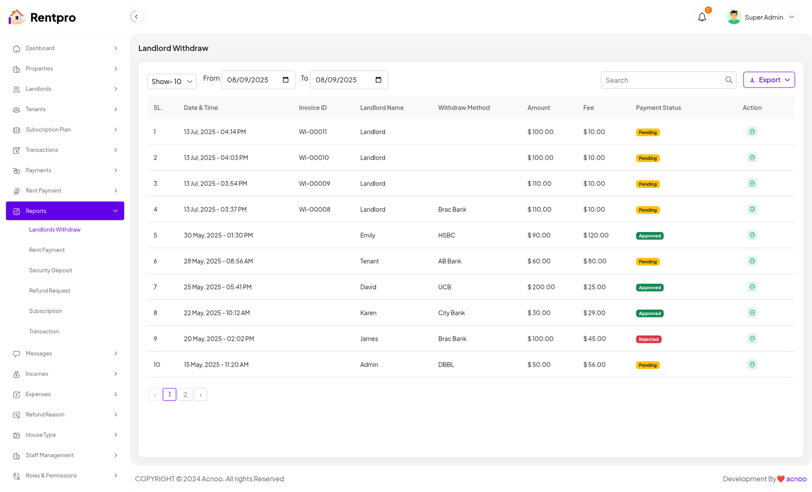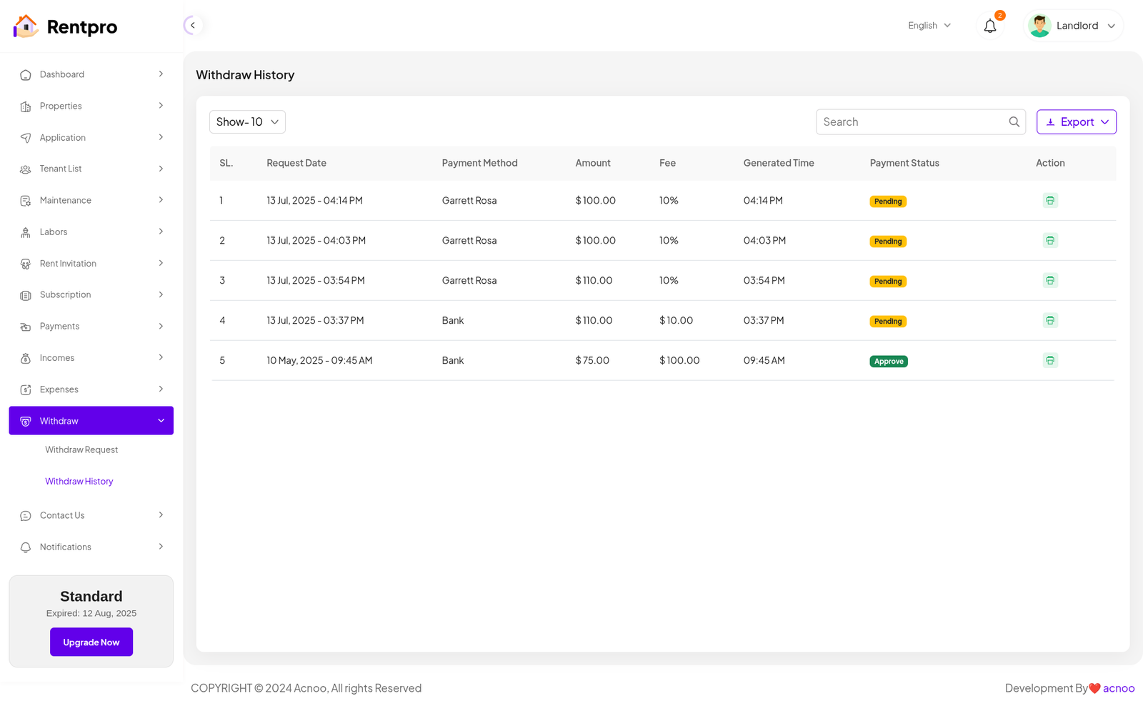 The "Withdraw Request" page is part of the financial management section of the Rentpro application. It provides a list of all withdrawal requests made by the landlord. This page allows the user to track the status of fund transfers from the Rentpro account to their own bank or payment method.