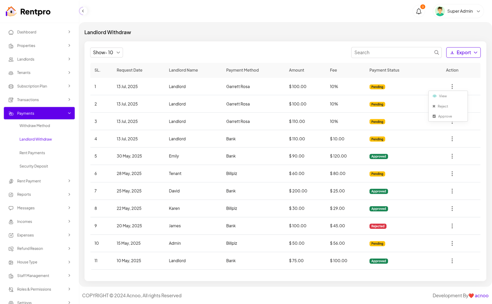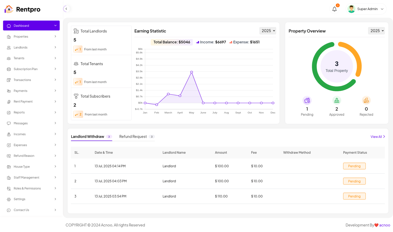 Pending Actions: At the bottom, a table lists critical pending tasks. This includes landlord withdrawal requests and refund requests. For each request, details such as the date, landlord name, amount, and payment status are provided. This table acts as a task list for administrators to process important financial actions.