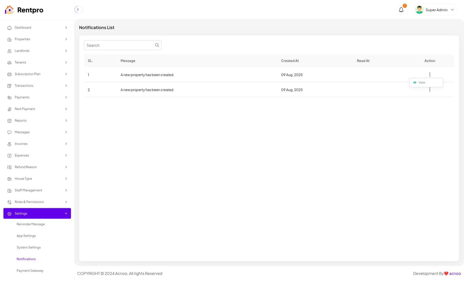 The "Notifications List" page serves as a centralized inbox for all system-generated notifications. It provides a historical record of important alerts and updates, ensuring that the user (landlord) is aware of key events within the application, such as new properties being created or other significant actions.