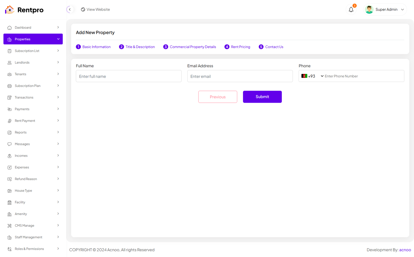 The "Add New Tenant" page in the Rentpro admin panel is used by administrators to manually create a new Tenant account. This is a secure and controlled way to onboard a new user who will list properties on the platform.