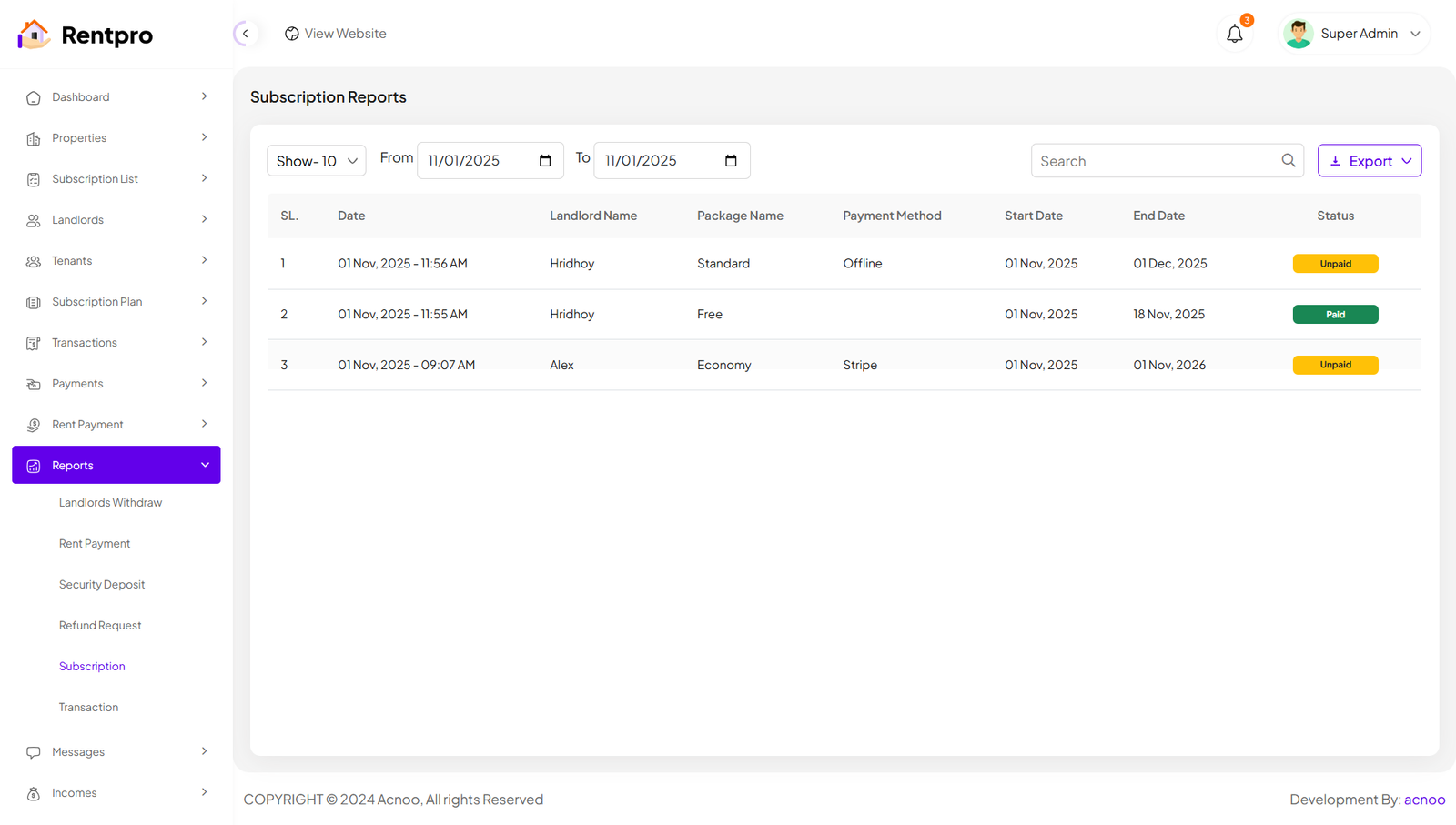 The "Active Landlord List" page displays all landlords who have a current and valid subscription plan. This is the list of landlords who are actively using the platform to list properties.