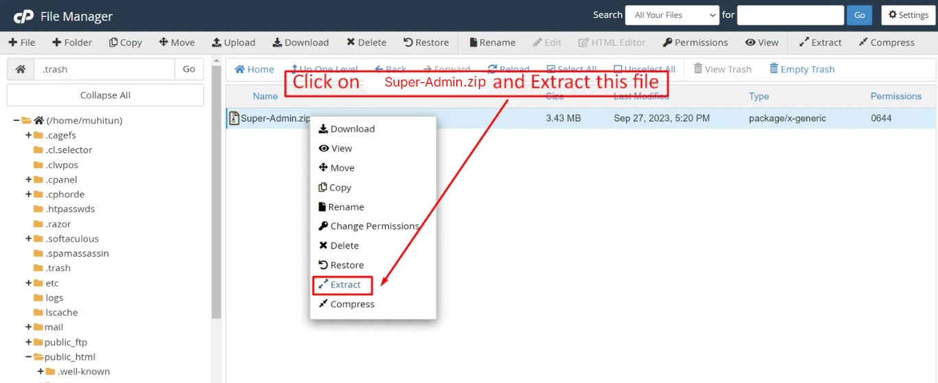 After creating a database, Upload the Super-Admin.zip file on the web root folder of your domain. This folder is generally called public_html, html, or example.com, but depending on your server's configuration, it might be named differently.